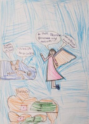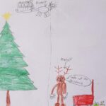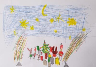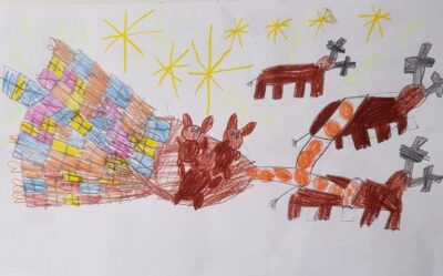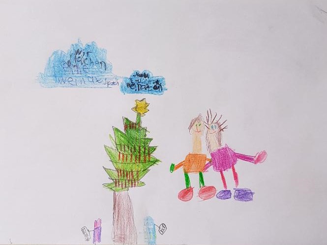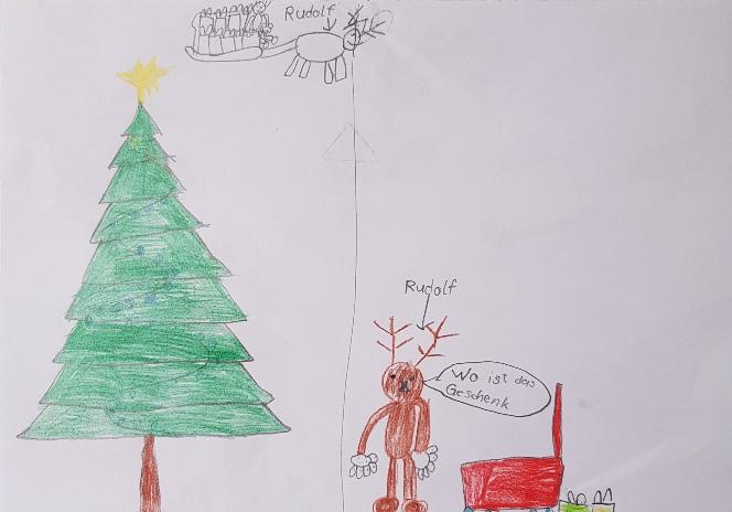 Zur Weihnachtsgeschichte „Als die Weihnachtsmänner rote Nasen hatten“ von A. Glitz / G. Dürr , die von den Kindern der 1. und 3. Klasse am Sternenfest aufgeführt wurde, haben die Zweitklässler gemalt und dazu geschrieben: