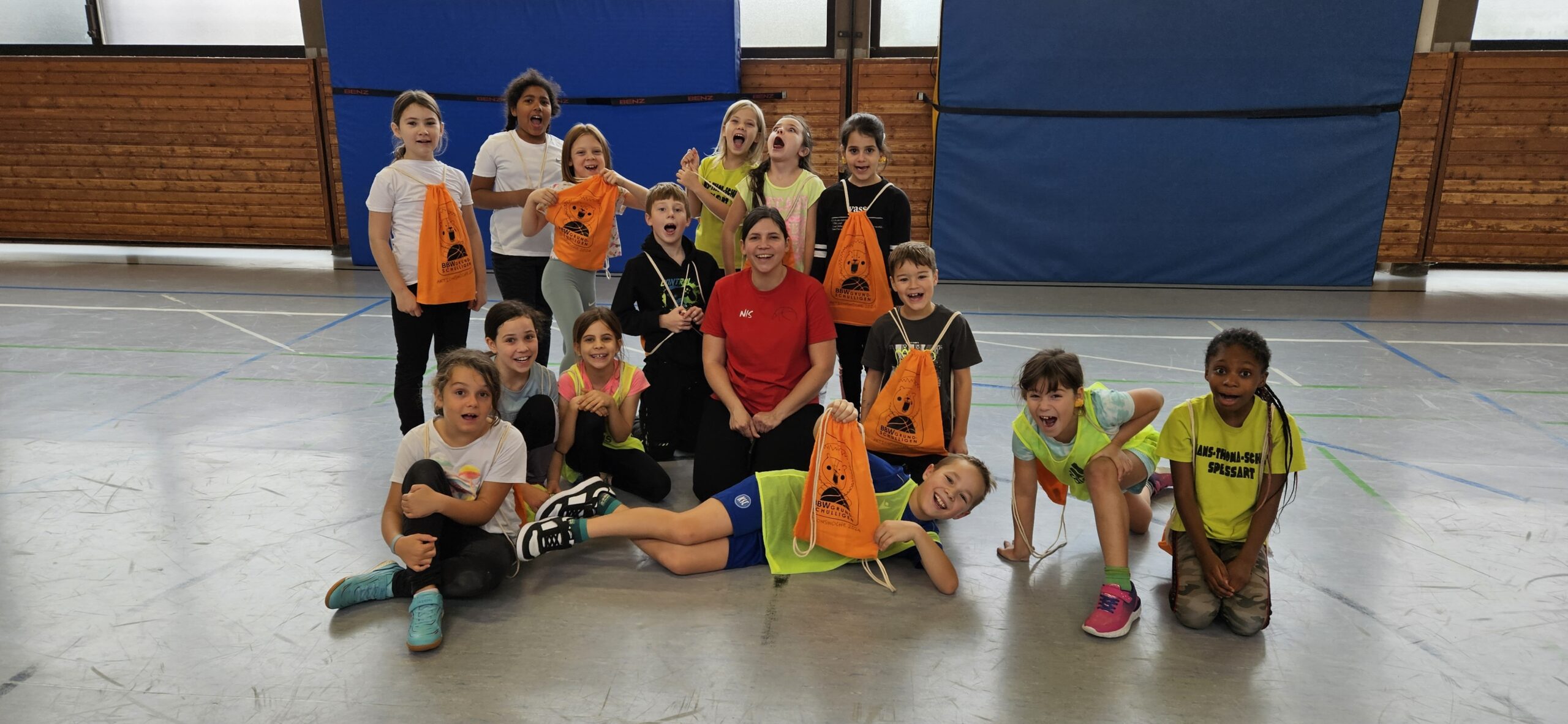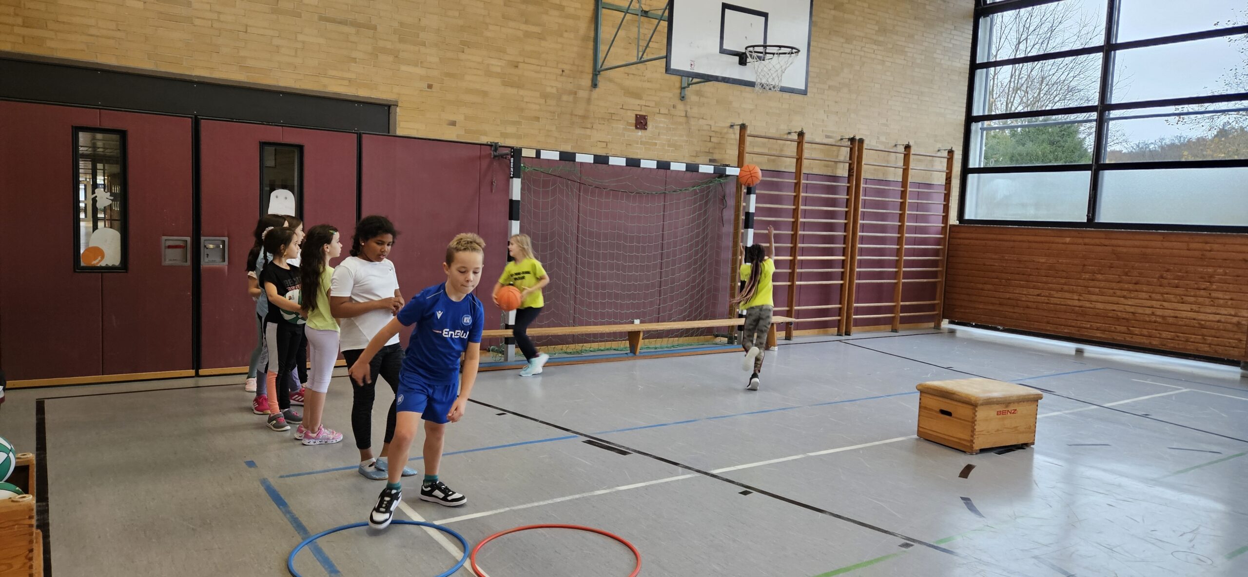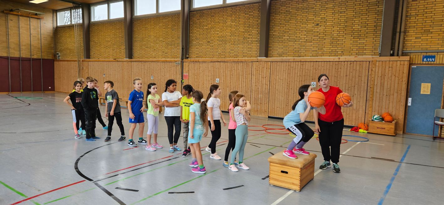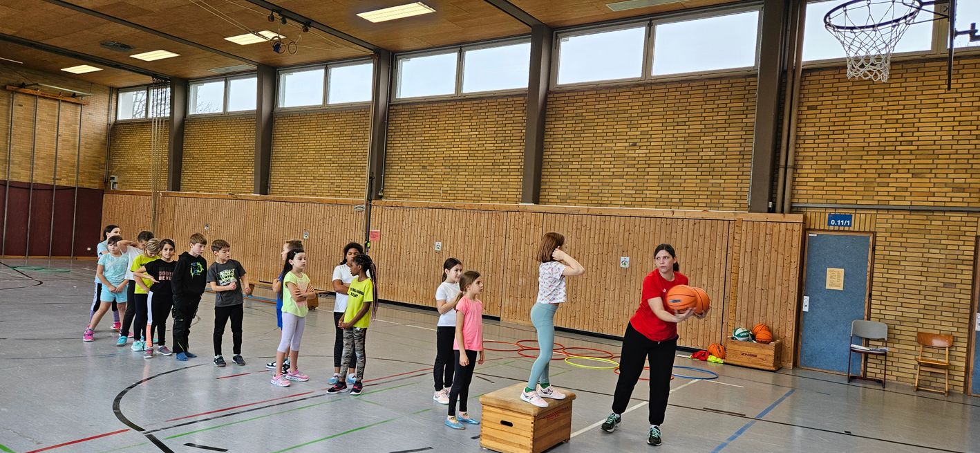 Auch dieses Jahr durften unsere Dritt- und Viertklässler am Basketballtag teilnehmen. Ermöglicht hat das der Basketballverband Baden-Württemberg in Kooperation mit dem TSV Ettlingen. Am 15.11. kam Frau Nina Skala, ein engagiertes und erfahrenes Vereinsmitglied mit vielen tollen Basketballspielideen im Gepäck zu uns an die Schule. Nach einem kurzen Aufwärmspiel übten die Kinder das Ballhandling auf abwechslungsreiche Art und Weise. Durch schnelle Passspiele und einen attraktiven Bewegungsparcours trainierten die Kinder neben Korbleger und Slalom-Dribbling auch Koordination und Ausdauer. Die Aufmerksamkeit und Konzentration wurden bei allen Spielen als Voraussetzung für ein gutes Zusammenspiel in den einzelnen Teams gefördert. Beim abschließenden Spiel Turmball mit Korbwurf fühlten sich alle Kinder wie große Basketballer/innen. Verabschiedet hat sich Frau Skala mit einem Turnbeutel für jedes Kind und einer vollen Stempelkarte für die erfolgreich durchlaufenen Übungen an diesem sportlichen Vormittag. Wir bedanken uns beim TSV Ettlingen für den diesjährigen Aktionstag an unserer Schule und freuen uns schon gemeinsam mit unseren Schülerinnen und Schülern auf das kommende Schuljahr.