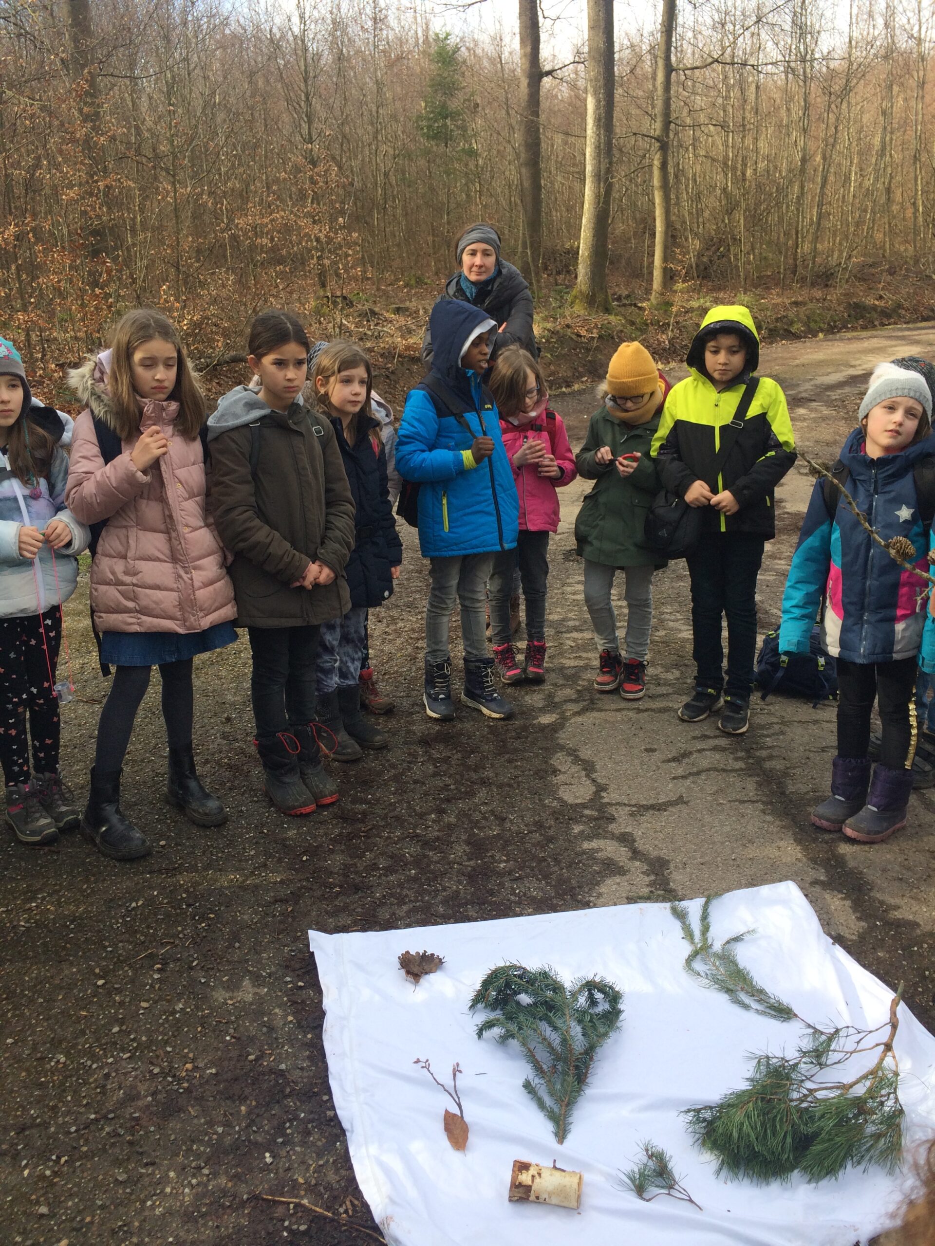 Am Donnerstag, den 24.02.22 machten wir, die Klasse 3 der HTS, gemeinsam mit Frau Zalewski und einigen Eltern eine Waldführung im Spessarter Wald. Geführt wurde dieses Walderlebnis von Frau Scheib, die für uns zahlreiche Stationen mit Erkundungsspielen vorbereitet hatte. Beim ersten Spiel waren wir Eichhörnchen. Unsere Aufgabe war es, unsere Wintervorräte zu vergraben und uns das Versteck zu merken. Nach getaner Arbeit ging es zur nächsten Station. Hier wurden wir mit verbundenen Augen von einem Mitschüler/in geführt. Es war schön den Wald zu hören, zu riechen und zu tasten. Nach einigen weiteren erlebnisreichen Stationen kam die langersehnte Frühstückspause. Frau Scheib und Frau Zalewski breiteten Picknickdecken aus. Die meisten Kinder haben die Pause für ein leckeres Frühstück an der frischen Waldluft genutzt. Einige Mitschüler/innen erkundeten den Waldboden und Pflanzen mit Becherlupen.
