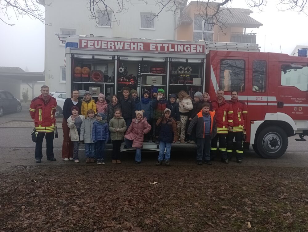 Am Freitag, den 30.01.26, bekamen die Kinder Besuch von der Spessarter Feuerwehr. Die Aufregung war groß, als das Feuerwehrfahrzeug vor der Schule ankam. In voller Montur betraten die Feuerwehrmänner das Klassenzimmer und beantworteten zunächst wichtige Fragen rund um ihre Arbeit: Was macht die Feuerwehr? Wie verhalten wir uns im Notfall? Und wie lautet der Notruf?