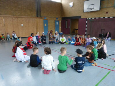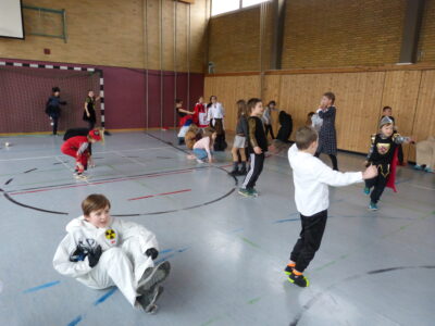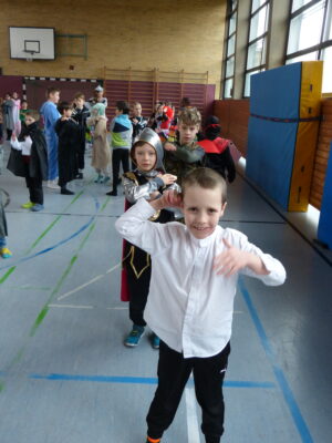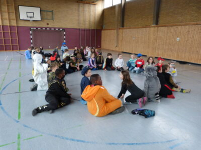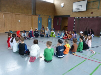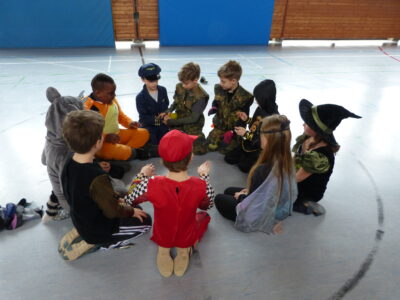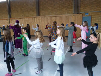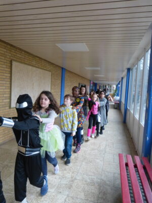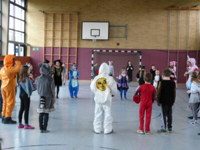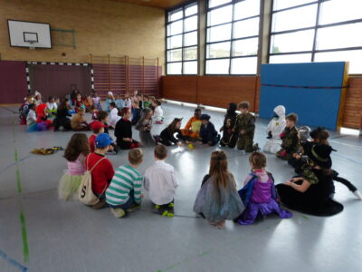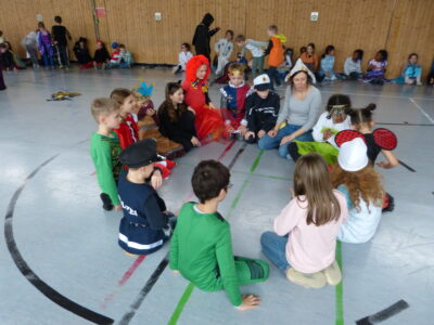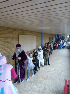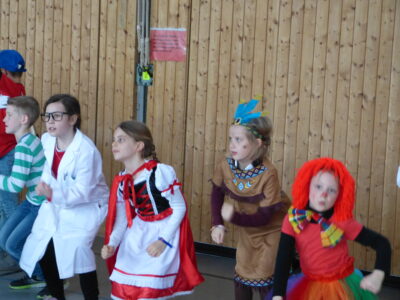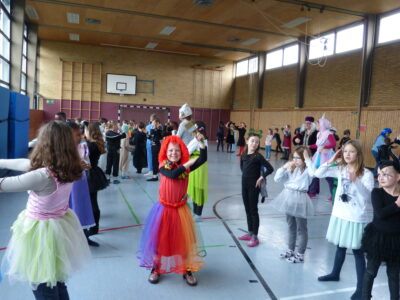 „Narri narro“ und „helau“ schallte es am Freitag vor den diesjährigen Winterferien ab 11.22Uhr durch unser Schulhaus. Alle Kinder und Lehrerinnen wurden in ihren Klassenzimmern von Dumbledore abgeholt und zogen dann gemeinsam als Polonaise bis in die Turnhalle. Dort fanden neben den traditionellen gemeinsamen Tänzen „Macarena“ und dem „Ententanz“ zwei Musikstoppspiele statt, „die heiße Kartoffel“ und „der Zeitungstanz“. Dazwischen durften die Kinder frei tanzen.