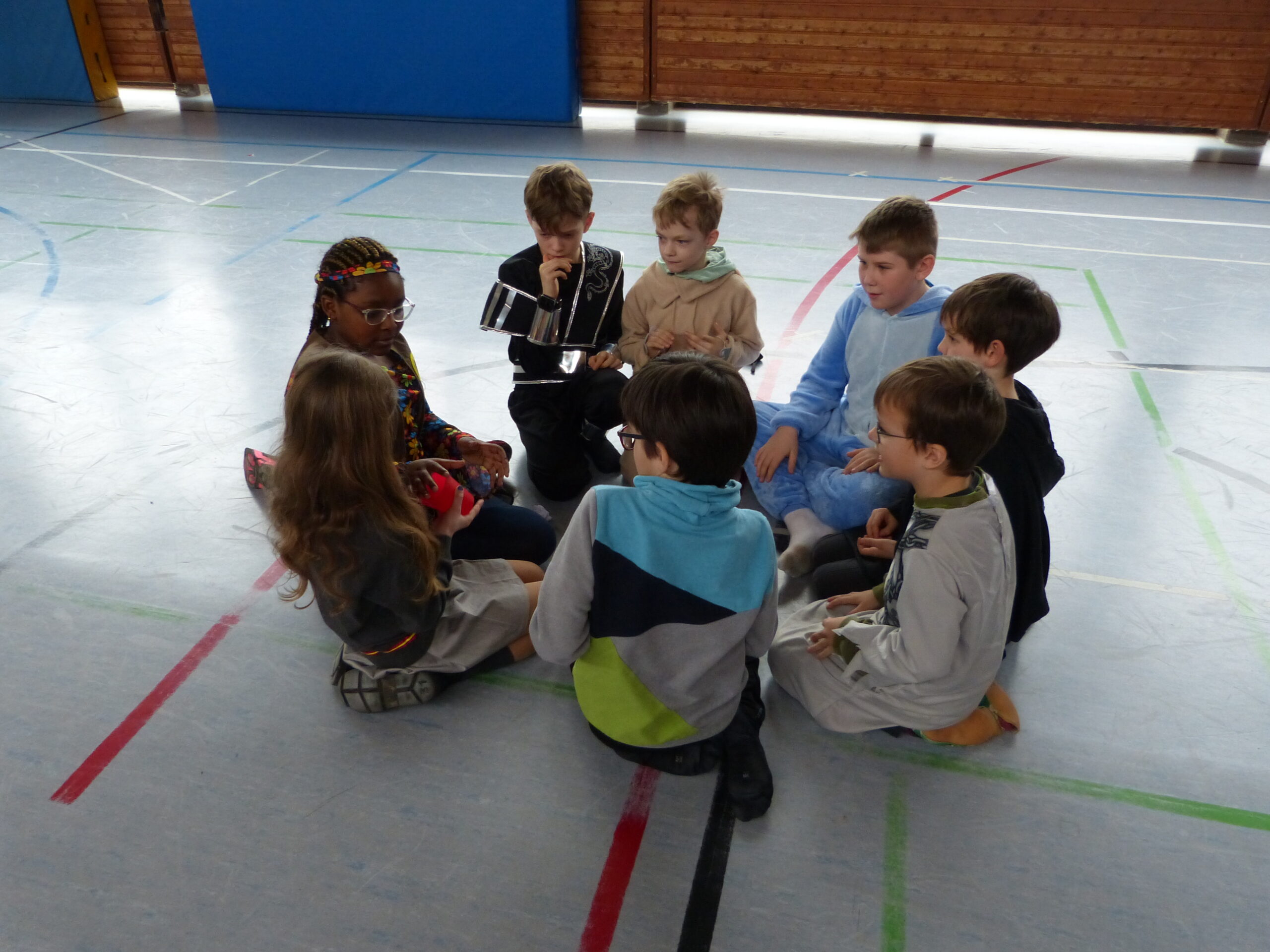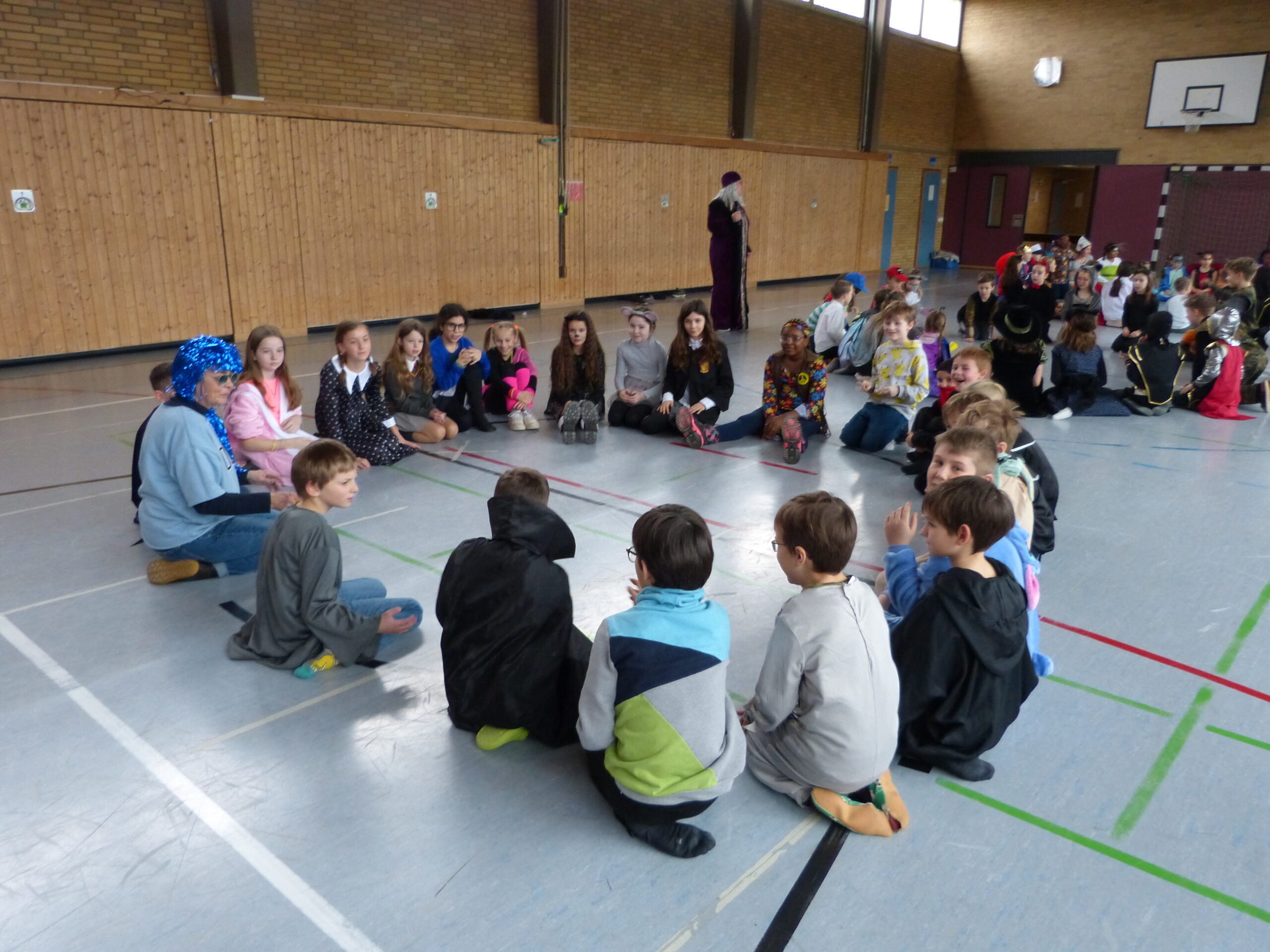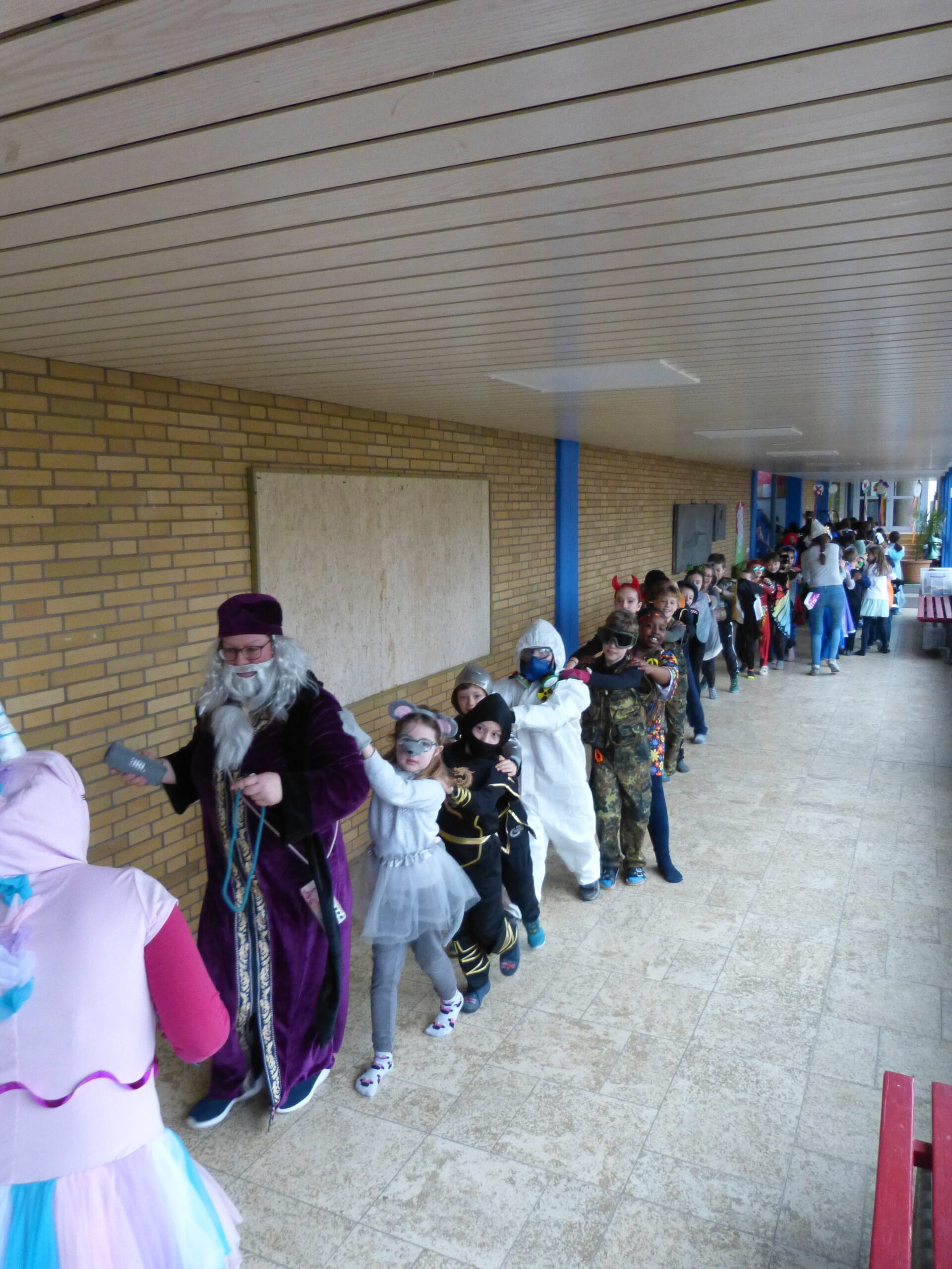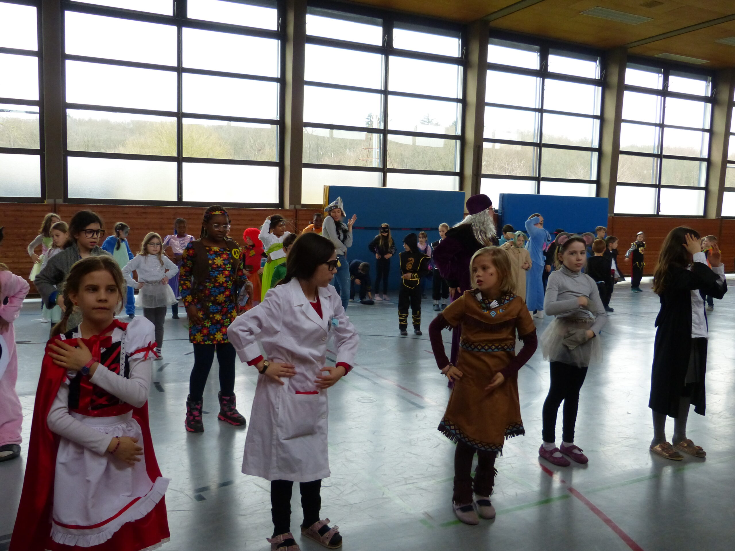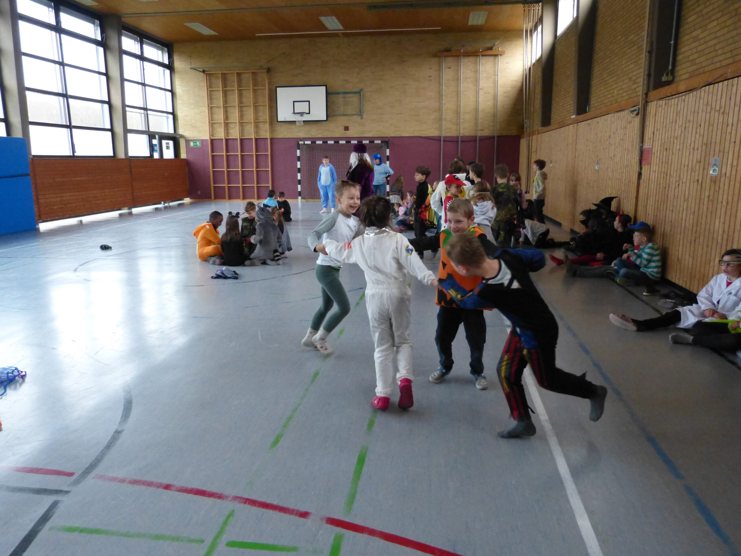„Narri narro“ und „helau“ schallte es am Freitag vor den diesjährigen Winterferien ab 11.22Uhr durch unser Schulhaus. Alle Kinder und Lehrerinnen wurden in ihren Klassenzimmern von Dumbledore abgeholt und zogen dann gemeinsam als Polonaise bis in die Turnhalle. Dort fanden neben den traditionellen gemeinsamen Tänzen „Macarena“ und dem „Ententanz“ zwei Musikstoppspiele statt, „die heiße Kartoffel“ und „der Zeitungstanz“. Dazwischen durften die Kinder frei tanzen.
