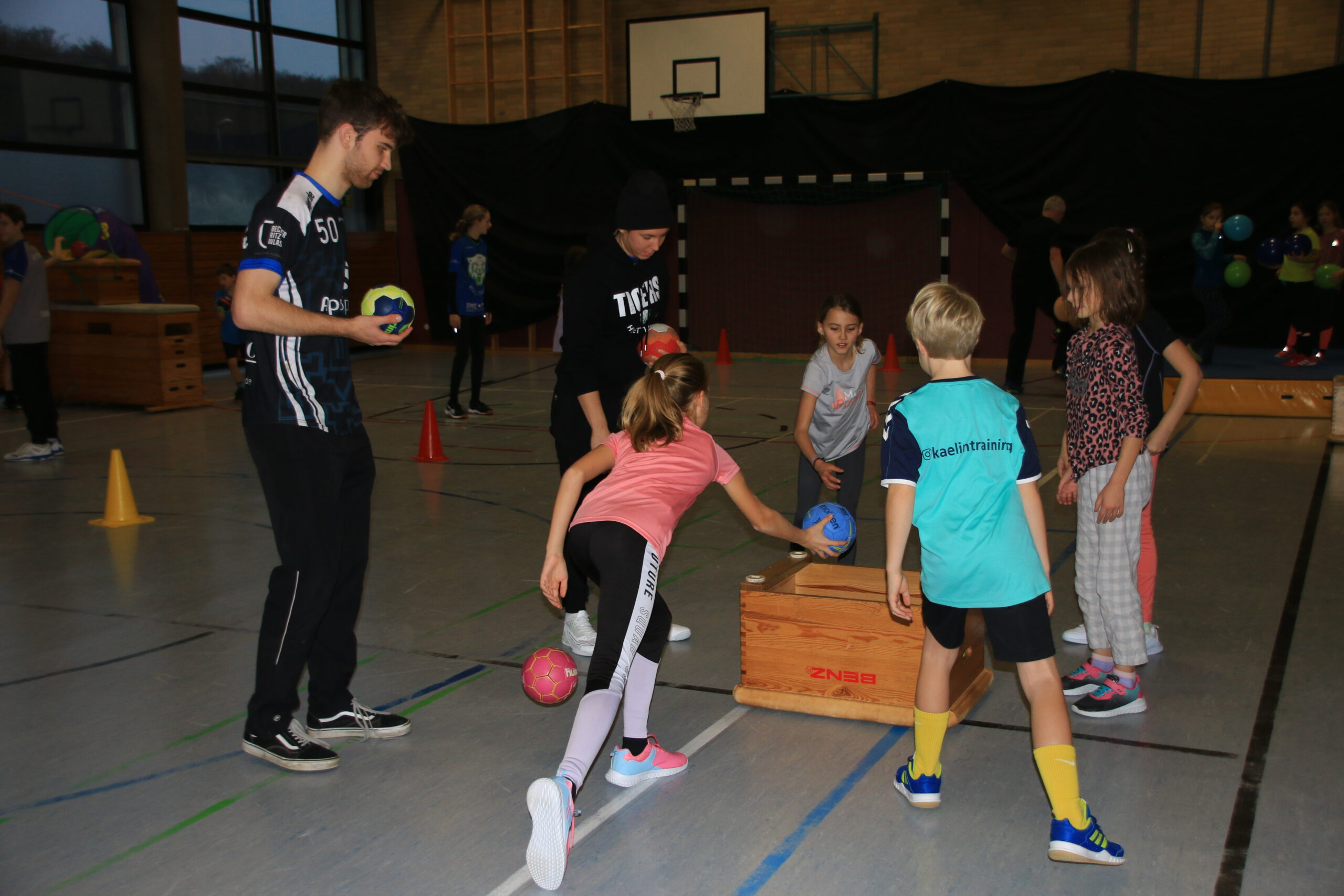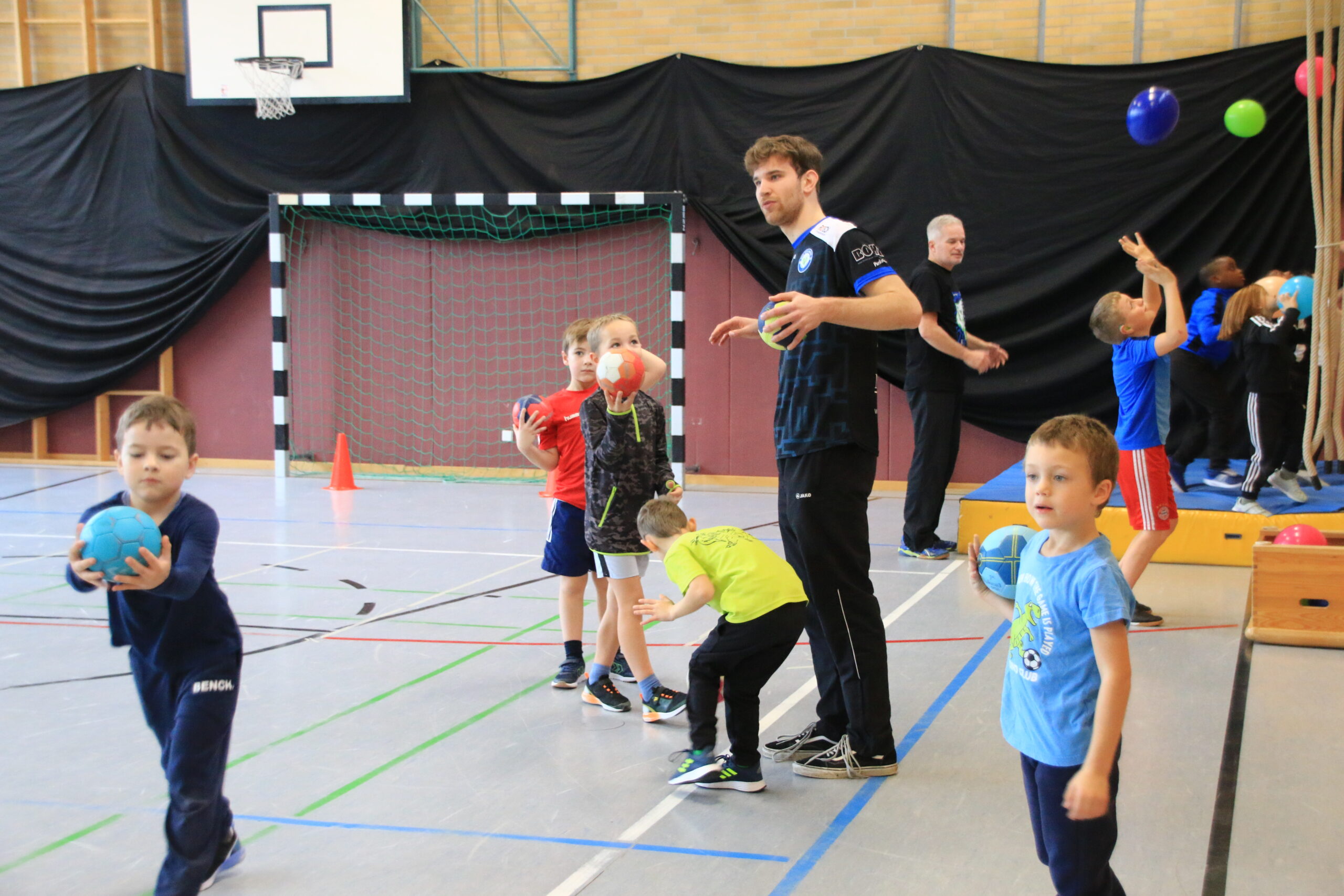 10 Spieler und Spielerinnen der HSG Bruchhausen waren gekommen, um die Grundschüler für die Sportart Handball zu begeistern. Unter der organisatorischen Leitung von Sandra Huth hatten sie verschiedene Stationen aufgebaut, an denen sich die Kinder ausprobieren durften.
