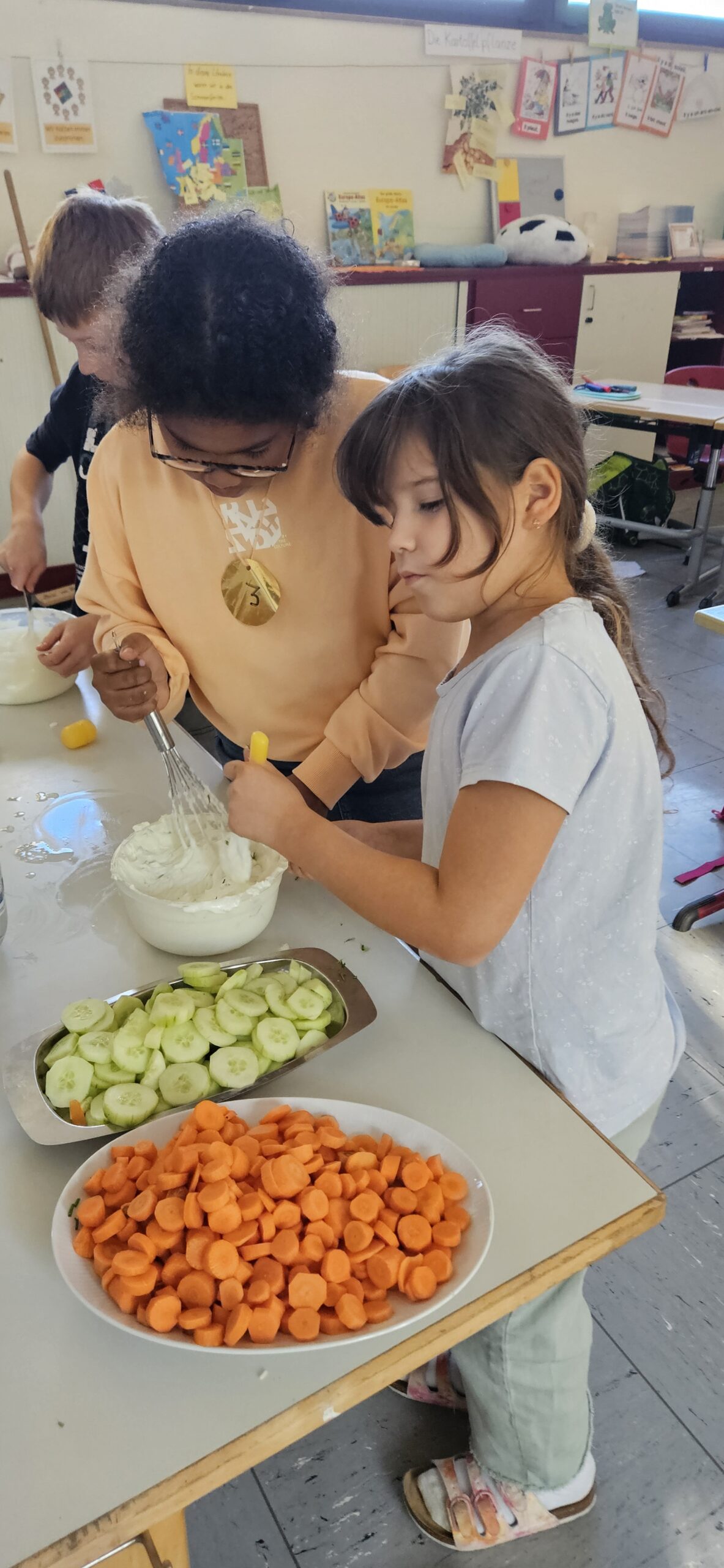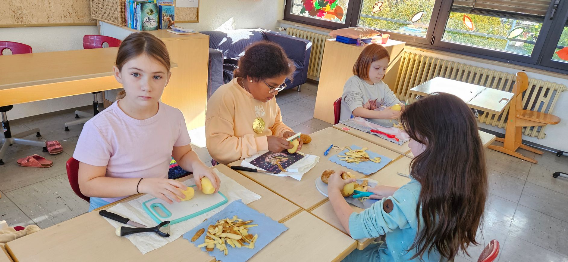 Die restlichen Kartoffeln brachte uns Herr Weber am darauffolgenden Tag in die Schule, sodass wir sie am Freitag mit Hilfe von zwei lieben Mamis zu leckeren Ofenkartoffeln bzw. Kartoffelspalten verarbeiten konnten. Alle Kinder schälten und schnippelten mit großer Freude Kartoffeln, Karotten und Gurken. Zusätzlich wurde zweierlei Quarks angerührt und die Wartezeit mit Schätzaufgaben und einem Kartoffelquiz überbrückt. Es schmeckte hervorragend und alle konnten schließlich gestärkt und glücklich in die Herbstferien starten.