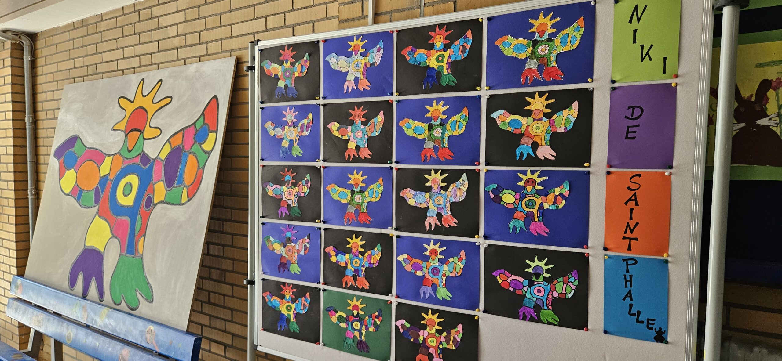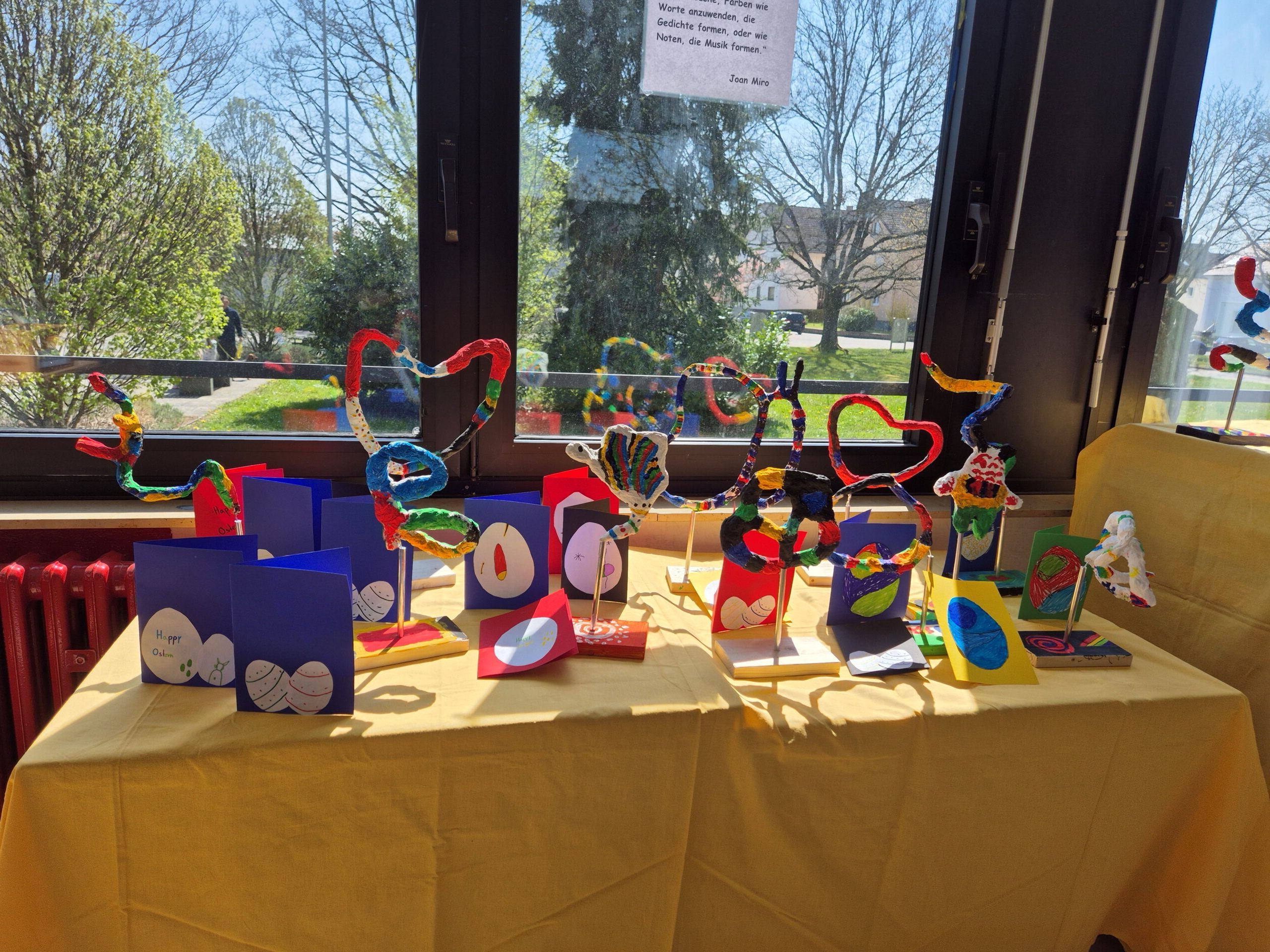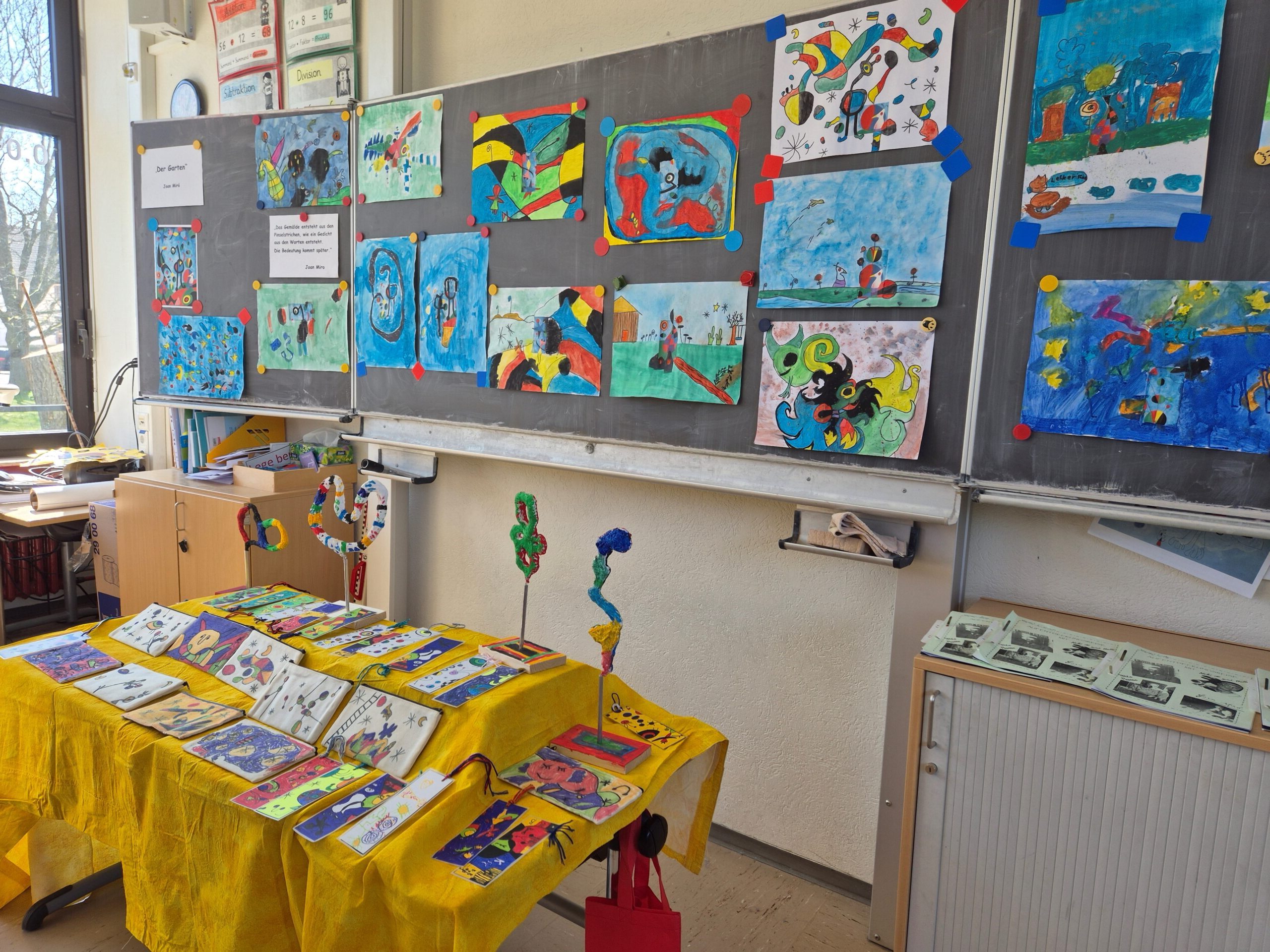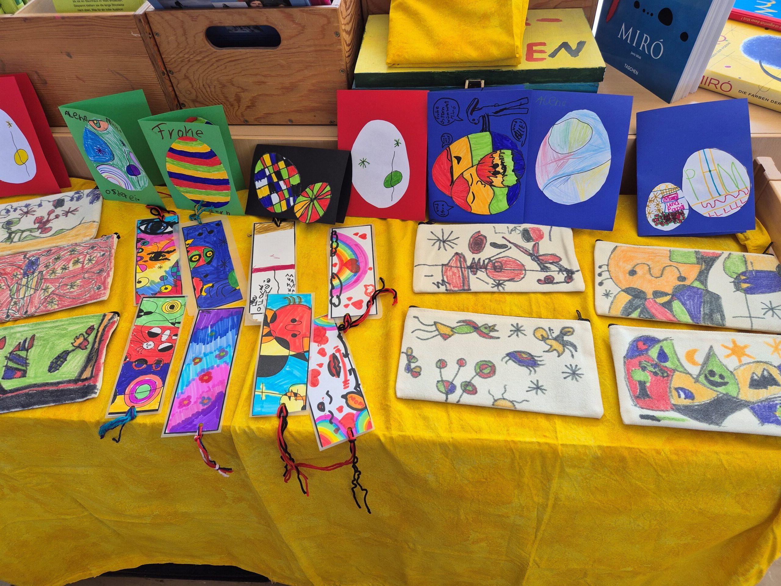 Es wurde gezeichnet und gemalt im passenden Stil der Künstler und es entstanden Portraits in bunten Farben. Die Schüler durften mit Modelliermasse und anderen Materialien wie Zeitungspapier, Kleister, Stoff, Pappe, Metall und Holz Kunstwerke erschaffen, sowie Skulpturen, Osterkarten, Lesezeichen, Mäppchen, ein großes farbenfrohes Bild für den Eingangsbereich im Schulhaus und Plastiken.