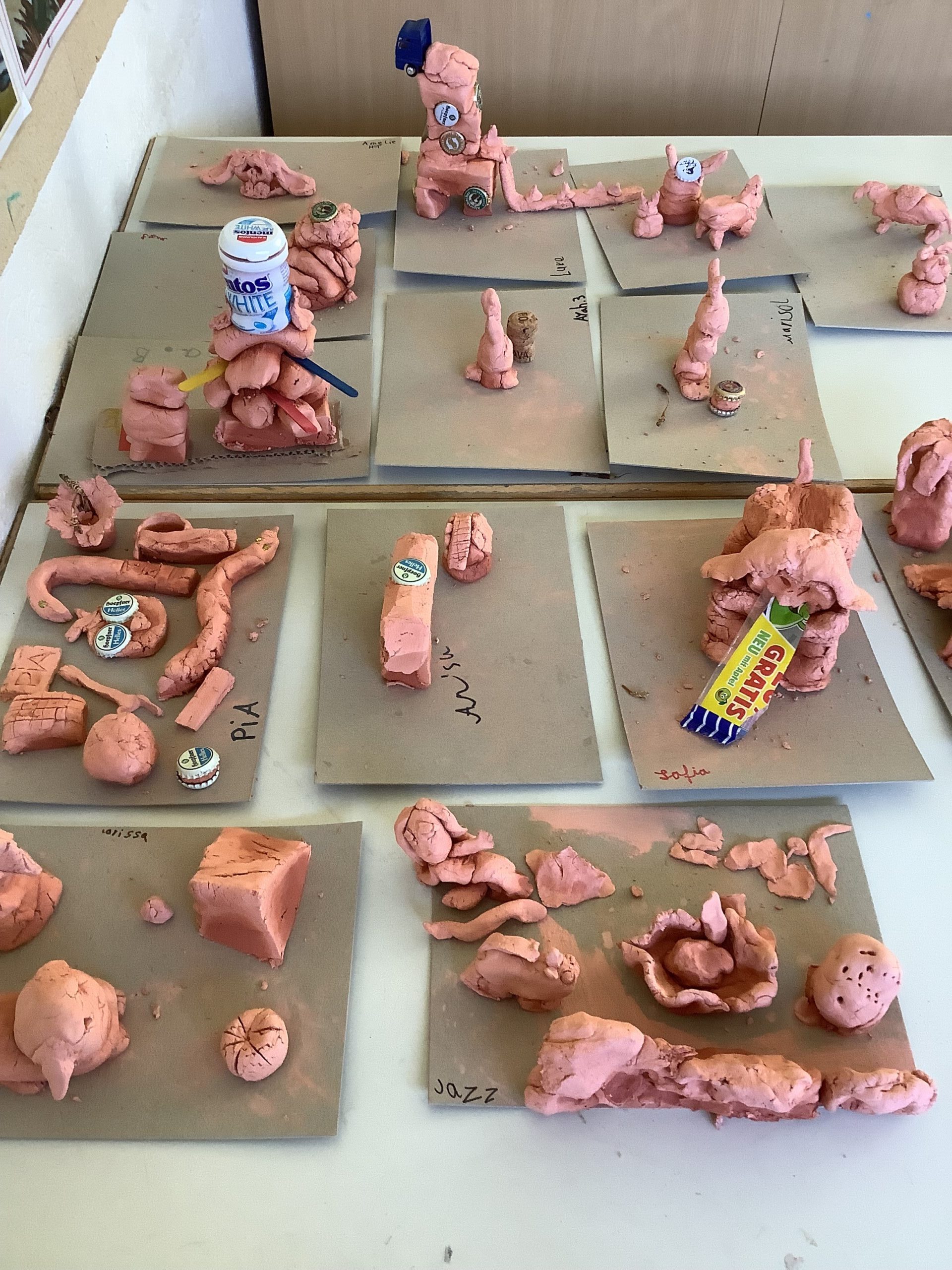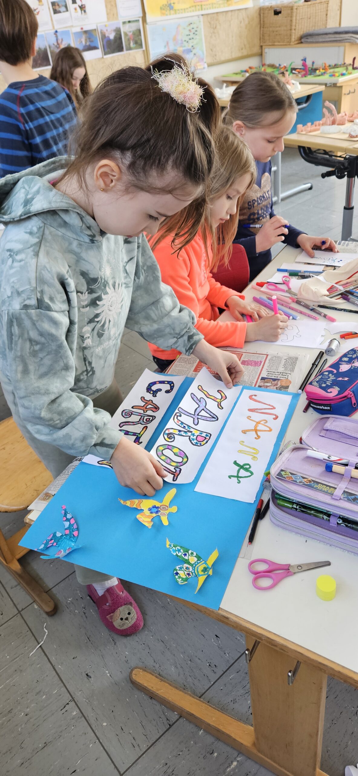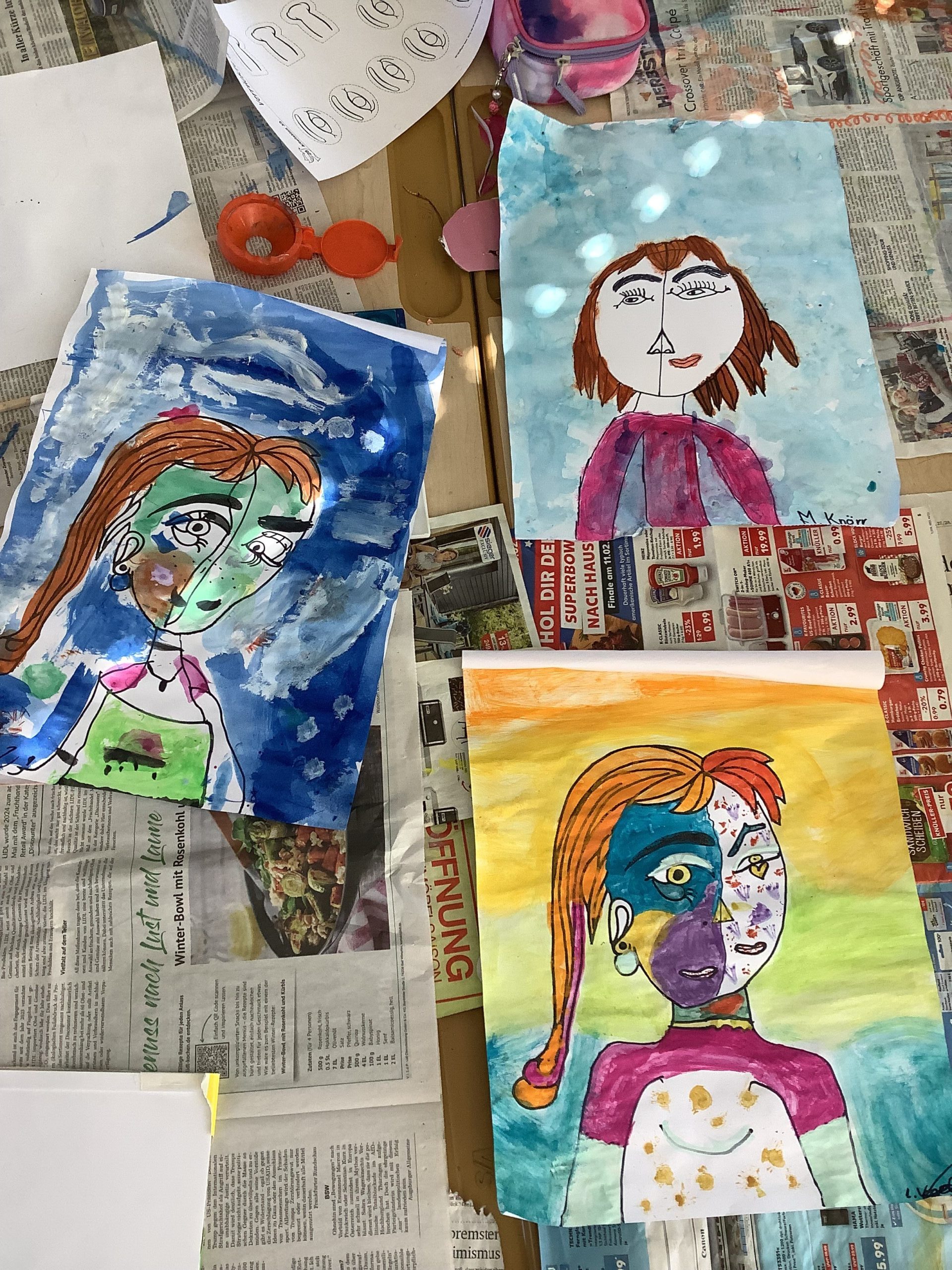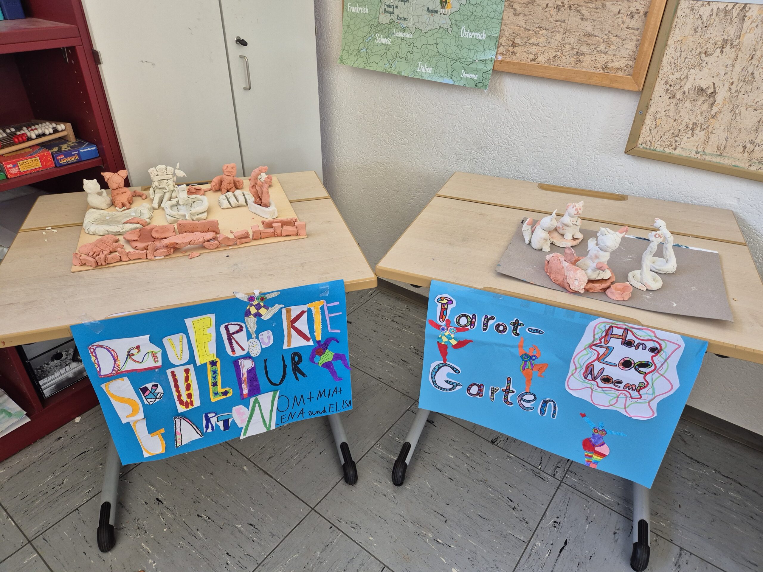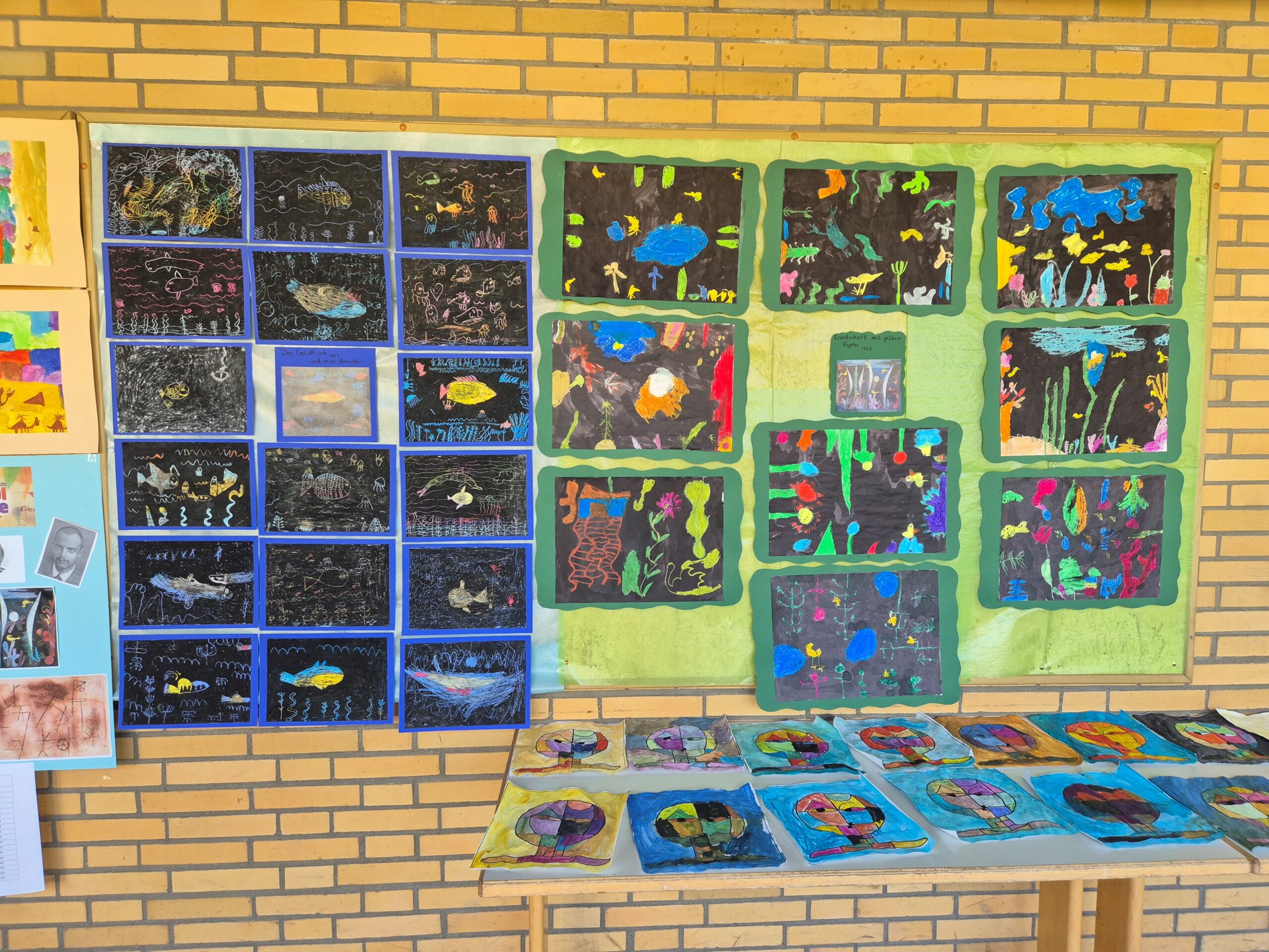 Es wurde gezeichnet und gemalt im passenden Stil der Künstler und es entstanden Portraits in bunten Farben. Die Schüler durften mit Modelliermasse und anderen Materialien wie Zeitungspapier, Kleister, Stoff, Pappe, Metall und Holz Kunstwerke erschaffen, sowie Skulpturen, Osterkarten, Lesezeichen, Mäppchen, ein großes farbenfrohes Bild für den Eingangsbereich im Schulhaus und Plastiken.