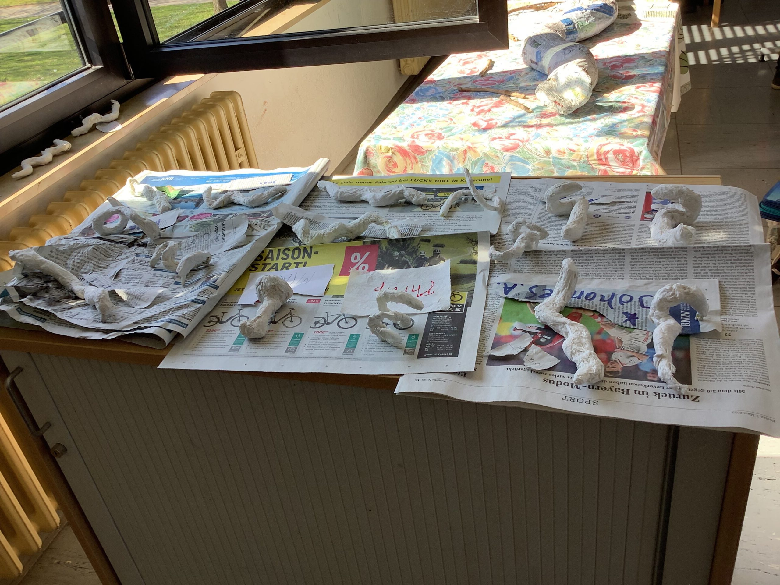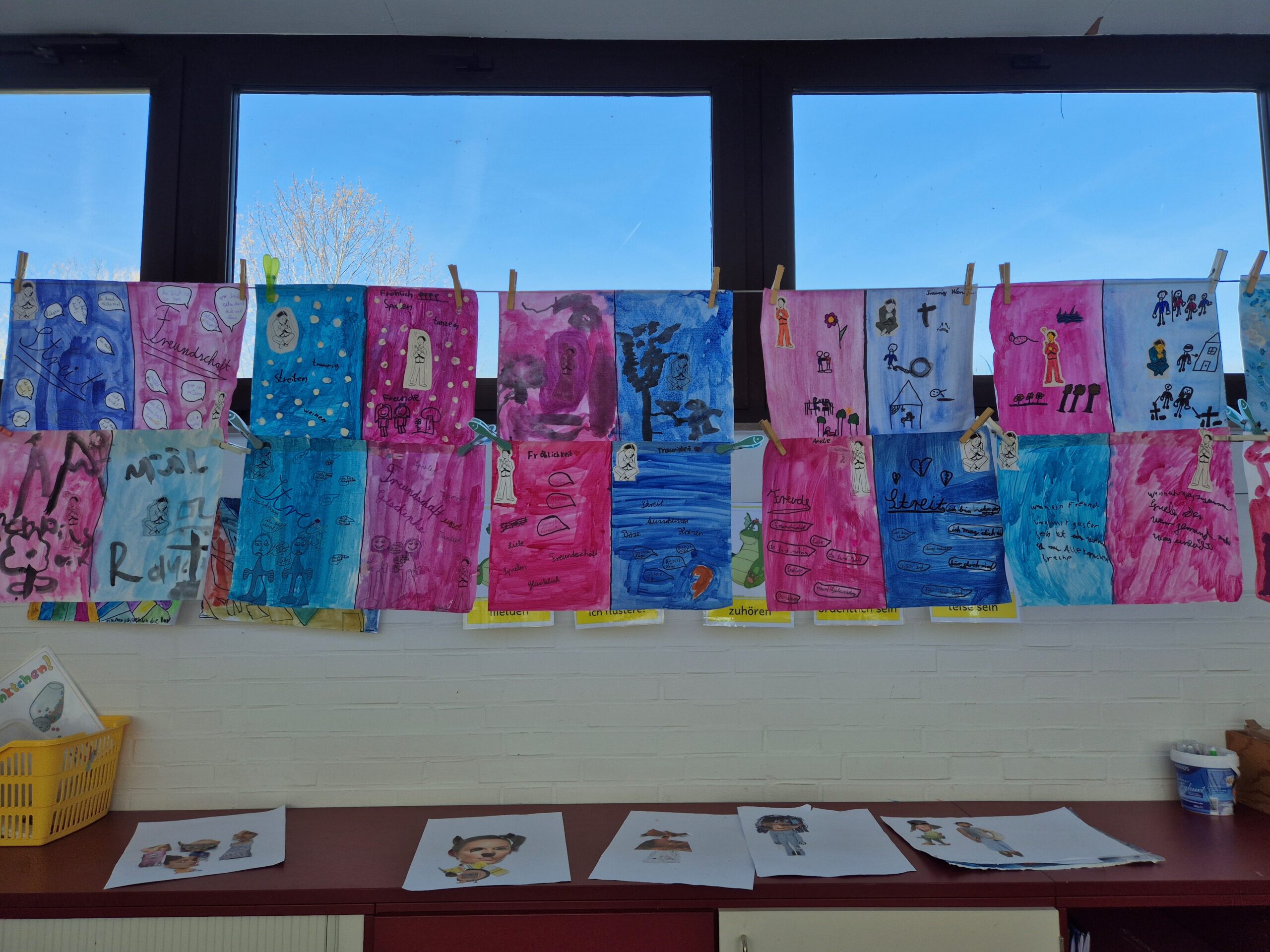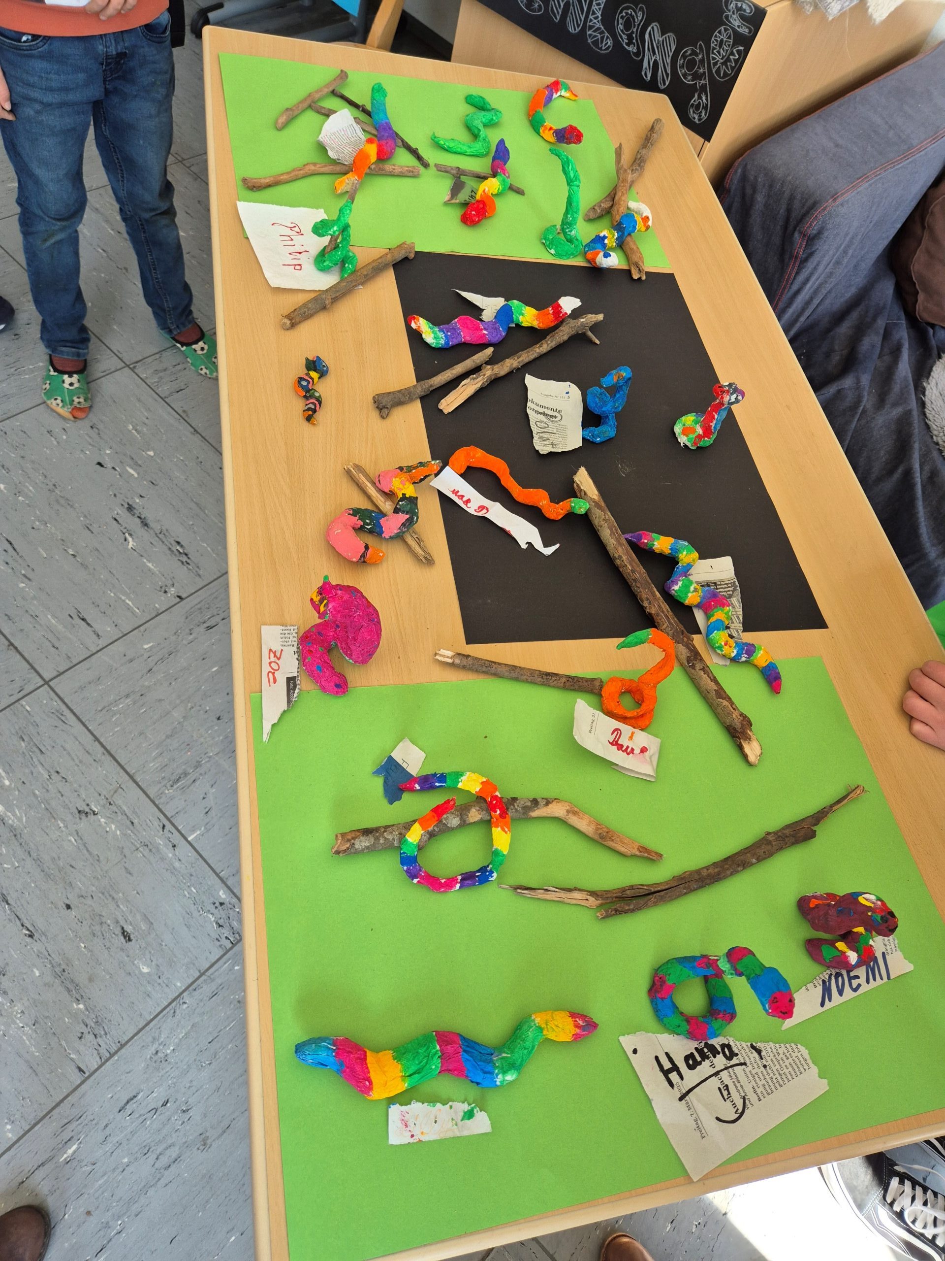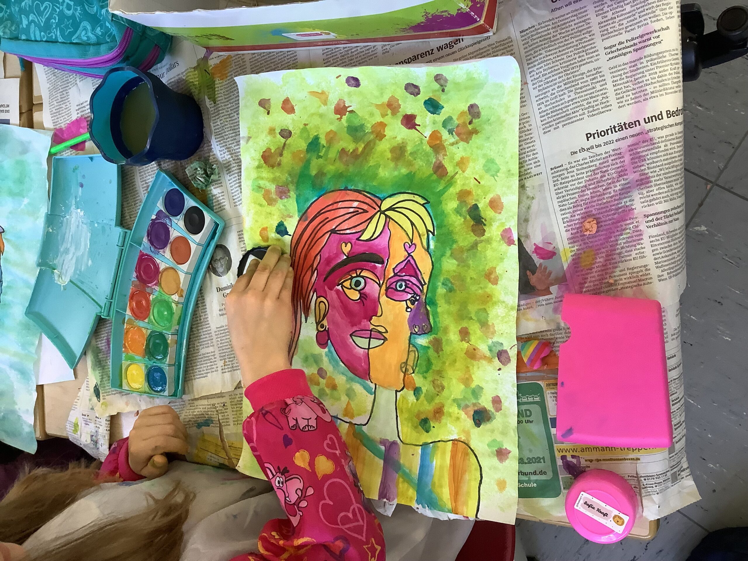 Es wurde gezeichnet und gemalt im passenden Stil der Künstler und es entstanden Portraits in bunten Farben. Die Schüler durften mit Modelliermasse und anderen Materialien wie Zeitungspapier, Kleister, Stoff, Pappe, Metall und Holz Kunstwerke erschaffen, sowie Skulpturen, Osterkarten, Lesezeichen, Mäppchen, ein großes farbenfrohes Bild für den Eingangsbereich im Schulhaus und Plastiken.