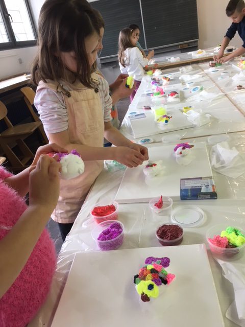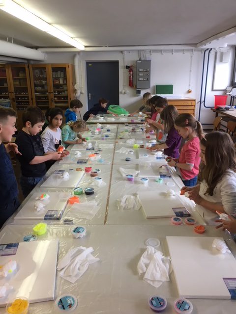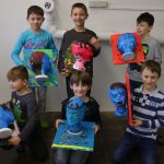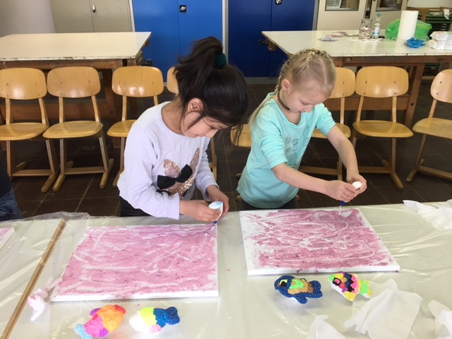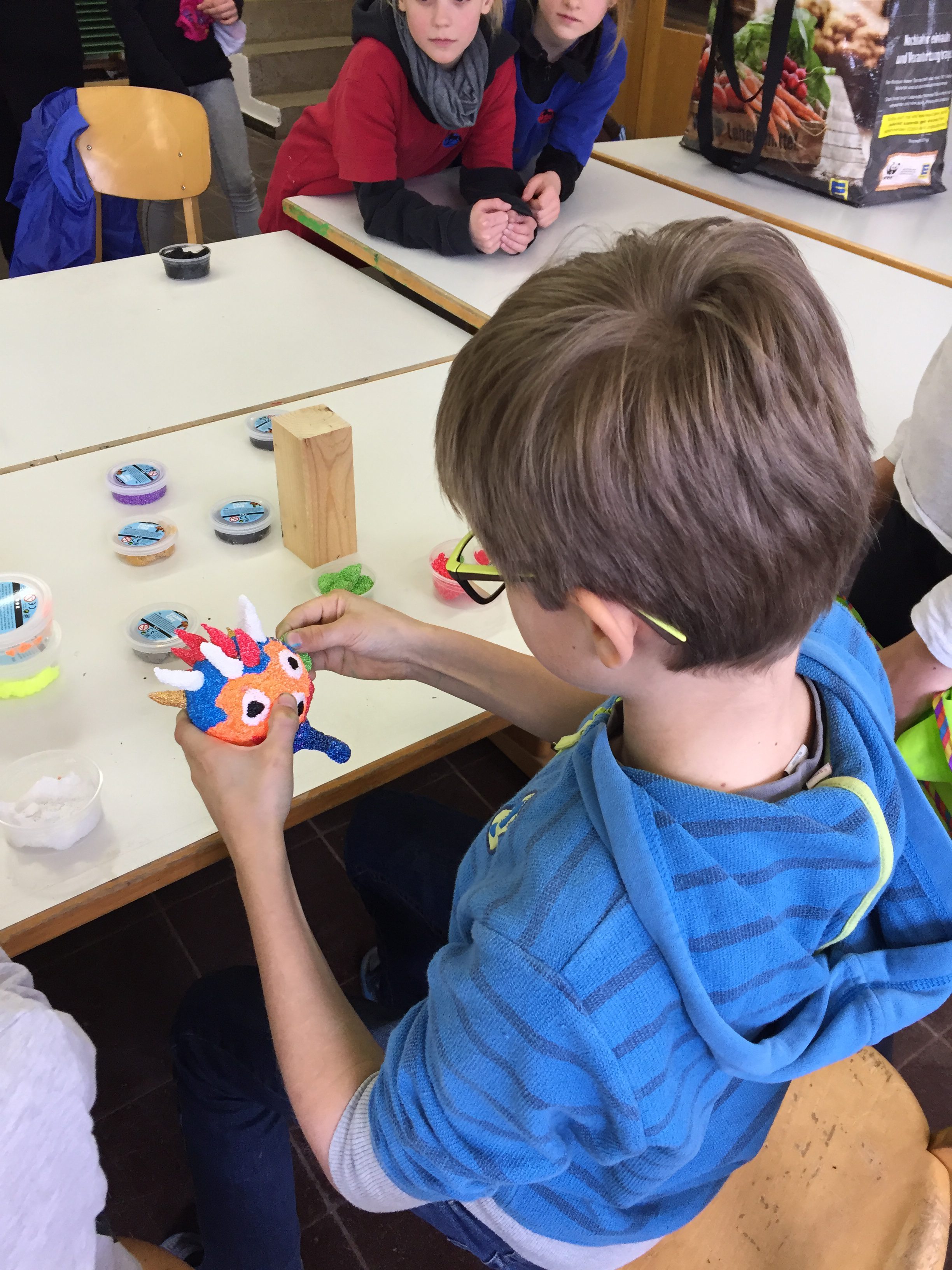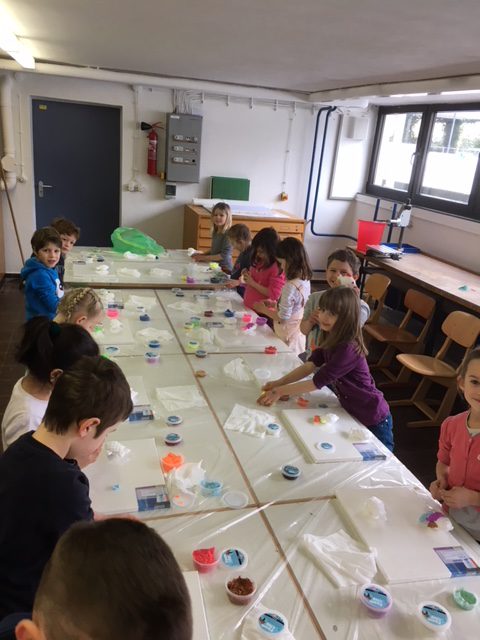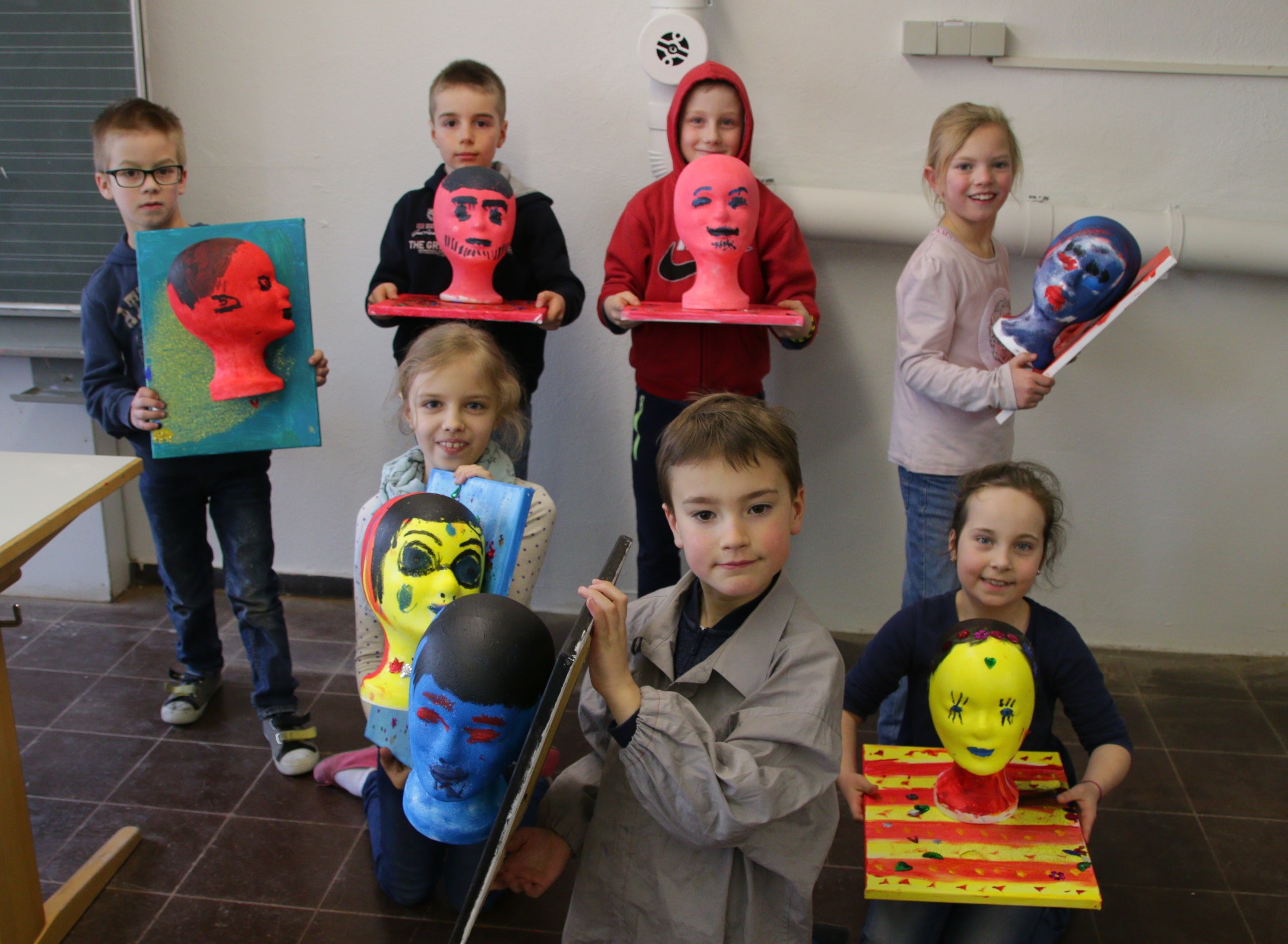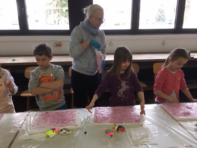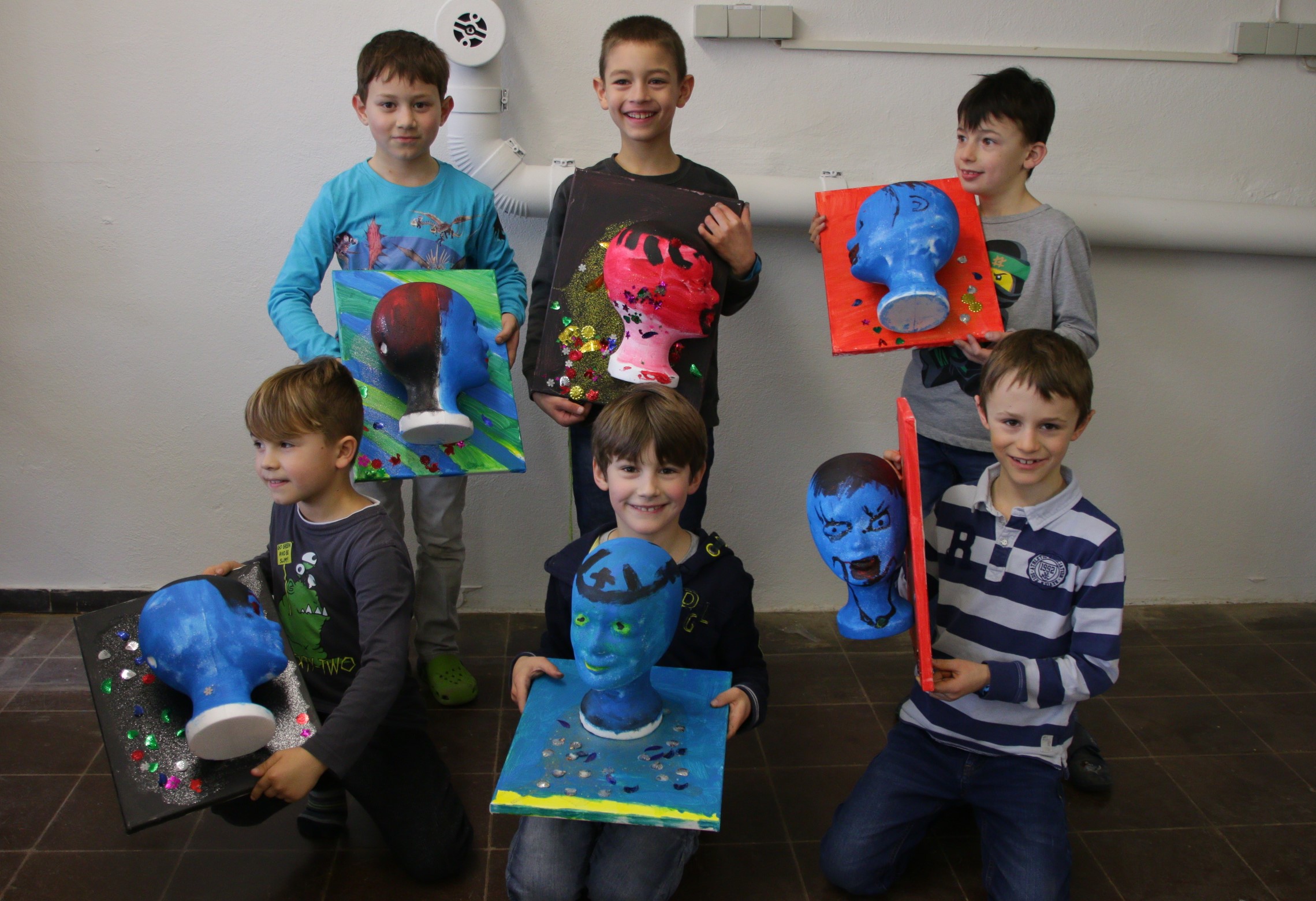 Ihre Kreativität wurde zusätzlich an einem Tag von der Künstlerin Anuschka Rausch gefördert, die ihr Atelier in Langensteinbach hat und sehr häufig mit Kindern arbeitet. So stellte die erste Klasse eine Collage mit Wackelpudding und Konfettifarbe her, die zweite Klasse schmückte Friseurköpfe mit Schmuck und Filzwolle und gestaltete einen Keilrahmen damit. Klasse 3 arbeitete mit Spiegelfliesen und malte Quatschbilder damit, während die vierte Klasse Portraits auf Plexiglas herstellte und Skulpturen aus Foam Clay auf Holz aufzog. Alle Kinder konnten sehr schöne Ergebnisse präsentieren, die nun im Schulhaus zu bewundern sind. Die Projekttage konnten dank der Unterstützung des Fördervereins so erfolgreich stattfinden. Herzlichen Dank!