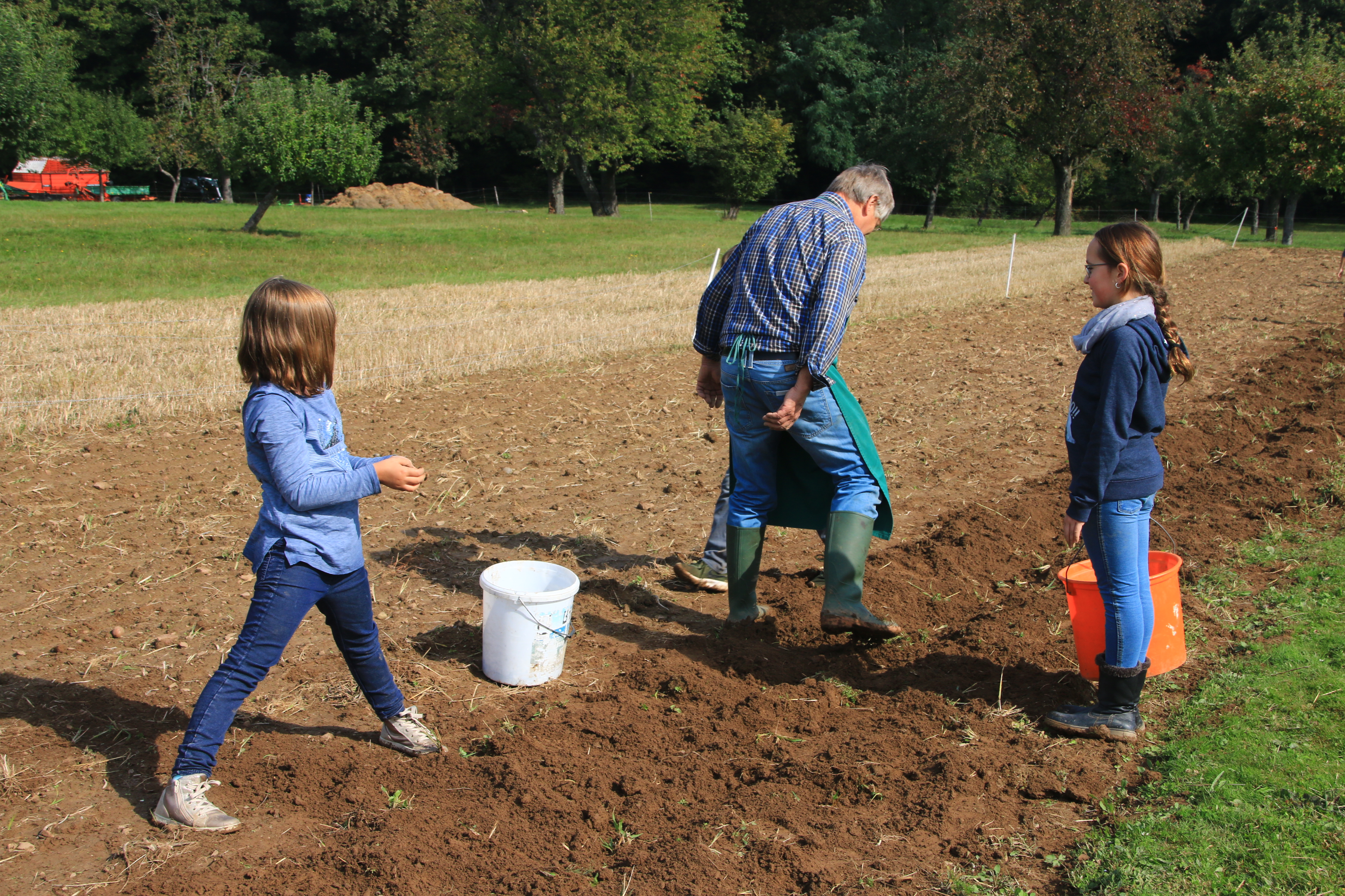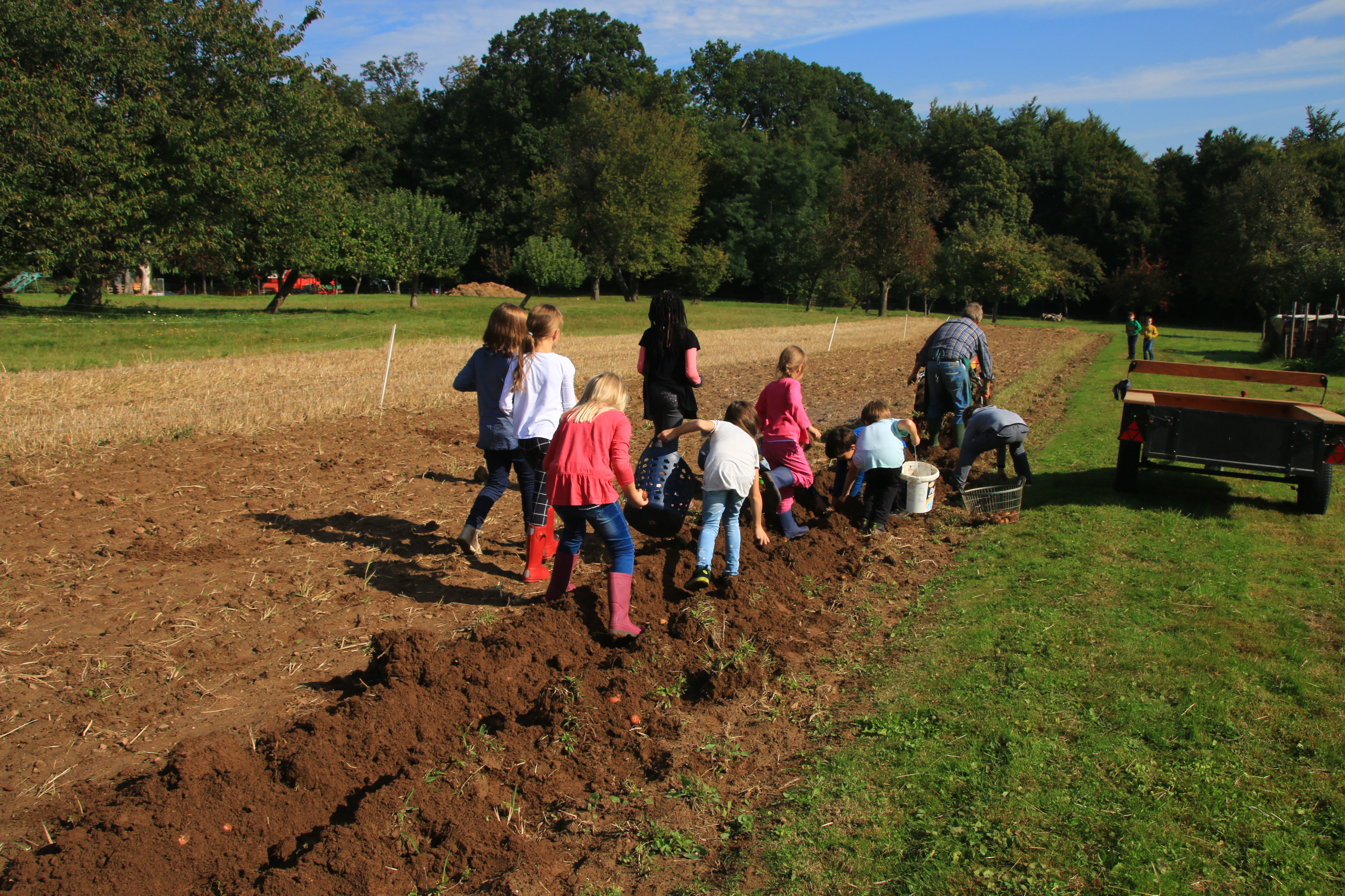 Diese spannenden Fragen stellen sich die Drittklässler zur Zeit zum Thema Kartoffel im Sachunterricht. Doch zunächst einmal ging es zur Ernte von Kartoffeln auf den Acker. Herr und Frau Weber vom Obst- und Gartenbauverein Spessart hatten eingeladen, auf ihrem Kartoffelfeld zu ernten. Nachdem Herr Weber eine Furche aufgeworfen hatte, konnten die Kartoffeln aufgelesen werden. Mit vollem Einsatz und großer Begeisterung stellten sich die Kinder dieser Aufgabe. Dabei musste zum Teil noch ganz ordentlich gebuddelt werden, um die Knollen auch wirklich alle zu finden. Schnell waren die zahlreichen Säcke und Eimer gefüllt und ihr Inhalt auf den Anhänger geschüttet. Zum Abschluss durfte sich jedes Kind noch ein Säckchen Kartoffeln mitnehmen und Herr Weber versprach, noch einen Eimer Kartoffeln zu spendieren, wenn es im Sachunterricht dann an das Ausprobieren von Kartoffelrezepten geht.