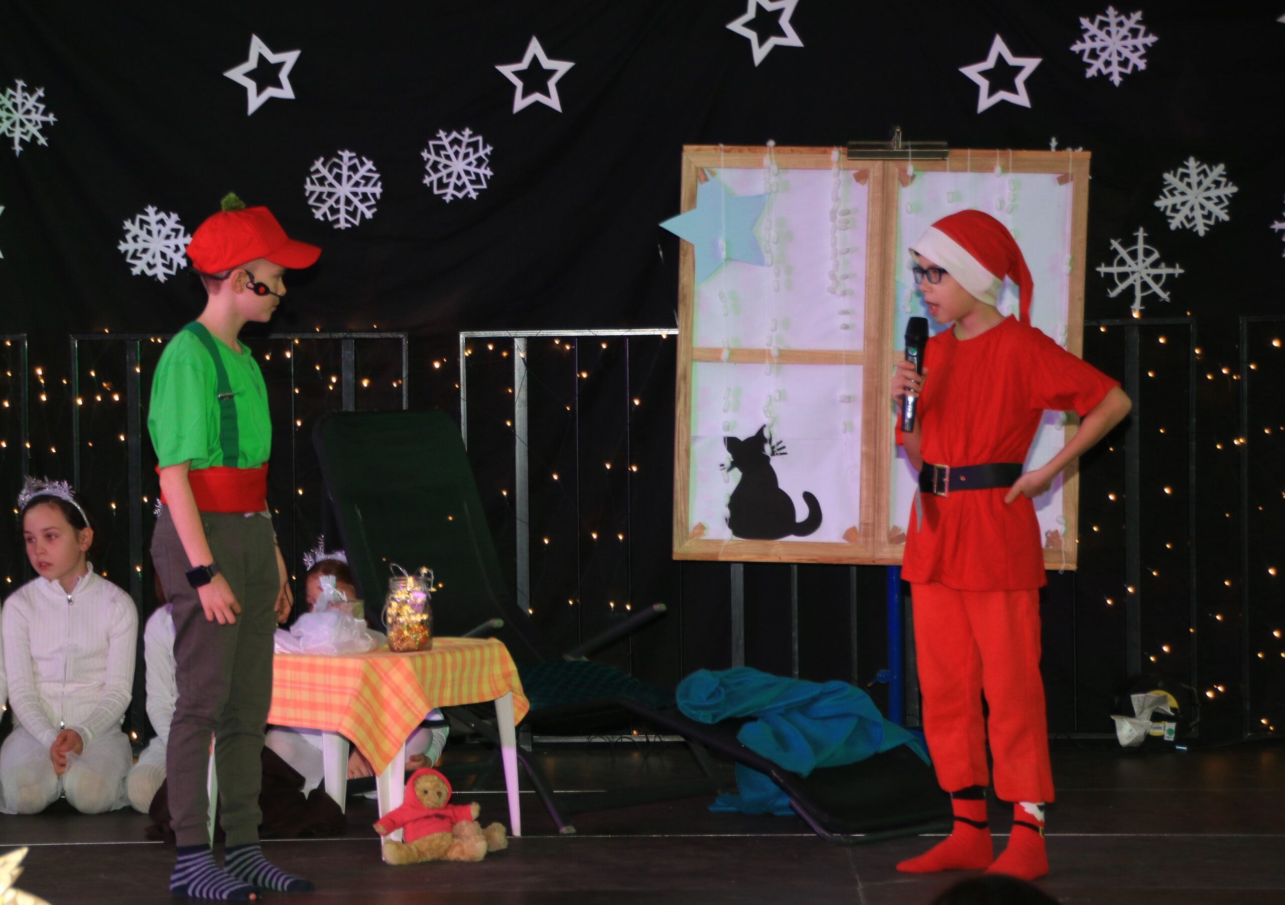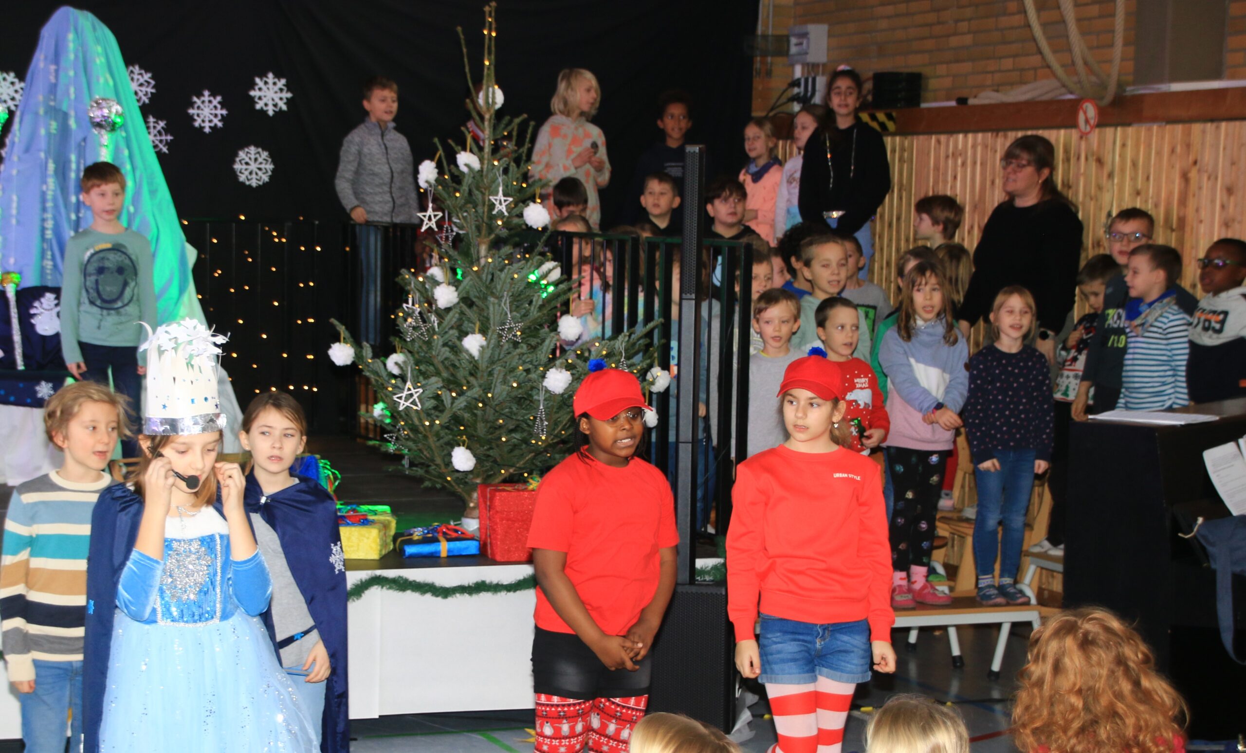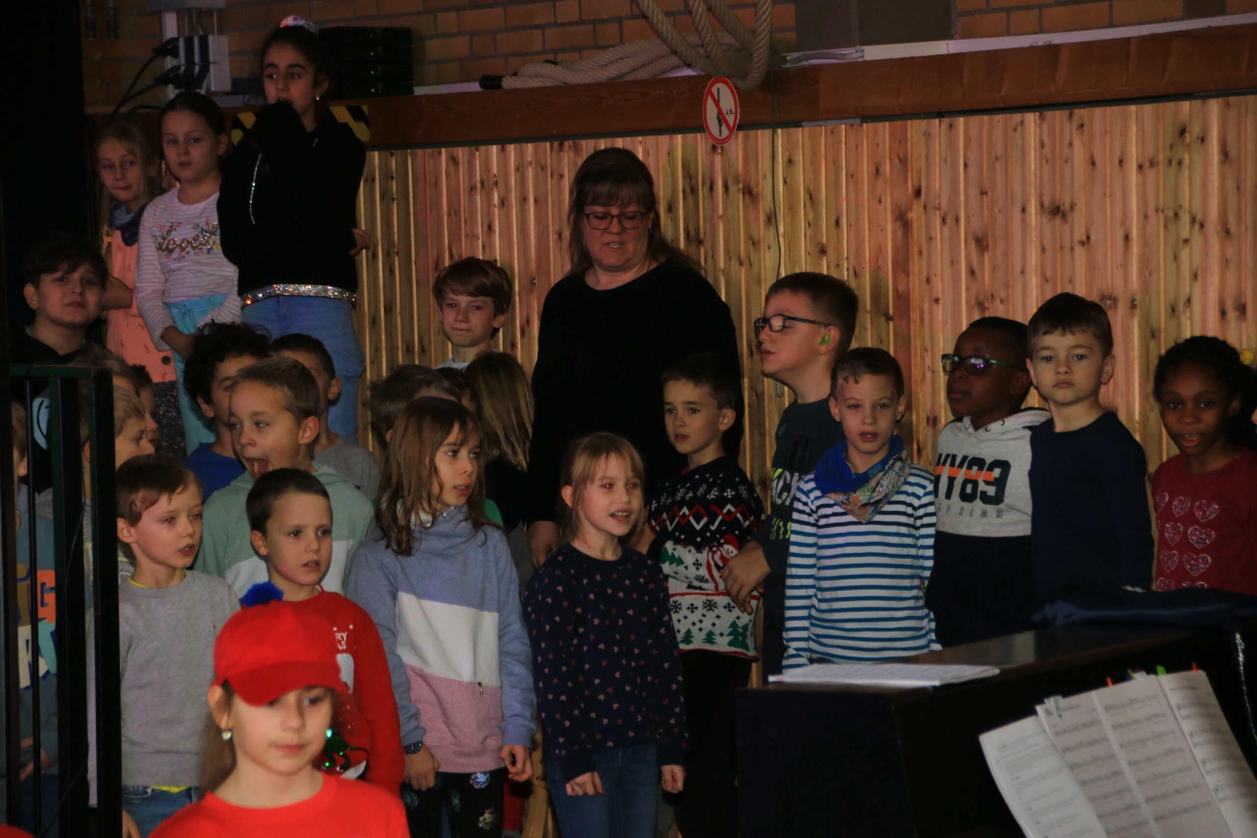 Seit Oktober wurden in einem Projektchor von allen Kindern der Schule die Lieder hierzu einstudiert. Auch dieses Mal wieder unter der musikalischen Leitung von Sonja Reinsfelder, Chorleiterin des Spessarter Gesangvereins Germania. Die Theater-AG mit Kindern der 2., 3. und 4.Klasse, unter der Leitung von Frau Laquai, spielte die Geschichte von Rudi, dem Wichtel, der einen wichtigen Weihnachtswunsch verschusselt hatte.